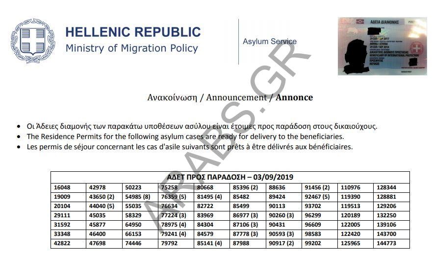 اليونان : تصاريح الإقامة الجاهزة الخاصة بحالات اللجوء بتاريخ 2019/09/03.