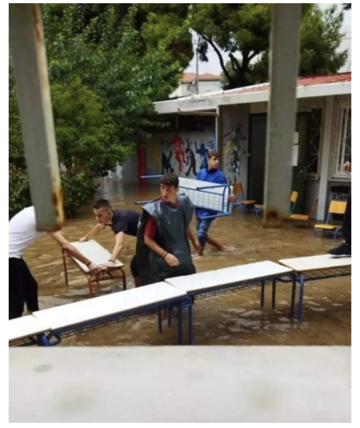 قال المعلم: “فقد غمرت المياه ساحة المدرسة ، حيث تراكمت أوراق الشجر والقمامة، بينما ساعدت الأرض المنحدرة على تراكم المياه“.