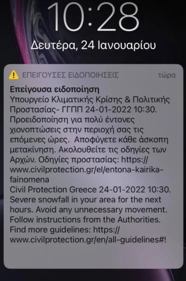 الجدير بالذكر أنه في تمام الساعة 10:30 صباحًا، أرسلت الحماية المدنية عبر 112، رسالة إلى سكان أتيكي، تحذر من تساقط الثلوج بكثافة في الساعات المقبلة.