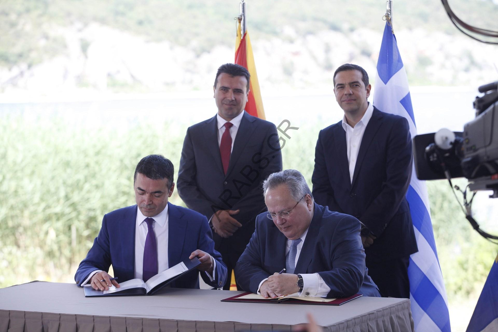 وسيشهد اليكسيس تسيبراس رئيس وزراء اليونان وزوران زايف رئيس وزراء مقدونيا توقيع وزيرا خارجية البلدين على اتفاق فى منطقة مطلة على بحيرة فى بريسبس، ووصل زايف بزورق وكان تسيبراس فى استقباله على الجانب اليونانى من البحيرة وتصافحا بحرارة.