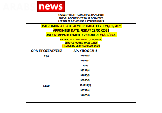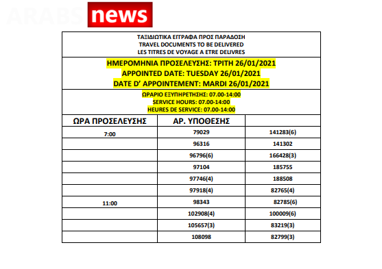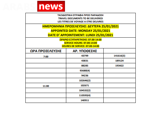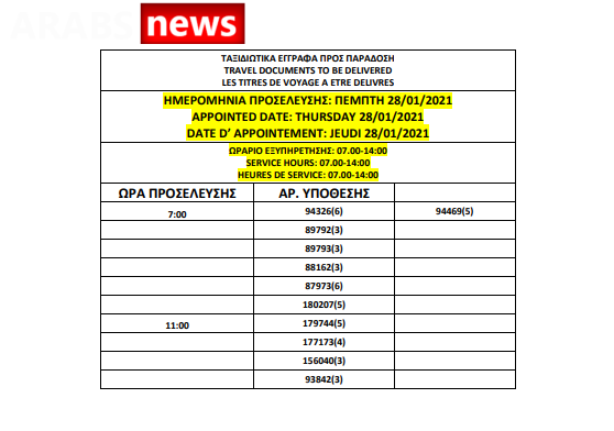 أصدرت دائرة اللجوء اليونانية اليوم الخميس 21 يناير 2021 أرقام جوازات السفر الجاهزة الخاصة بحالات اللجوء، وسيتم تسليم الجوازات بين 25 و29 يناير 2021، من الساعة 7 صباحاً حتى الساعة 2 ظهراً كما هو موضح أدناه.