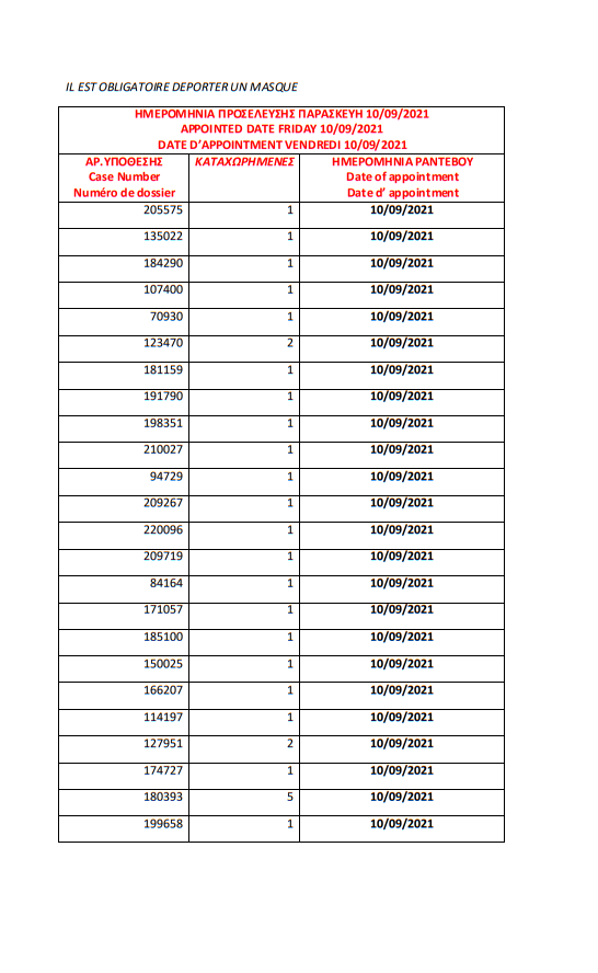 أصدرت وزارة الهجرة اليونانية في مدينة ثيسالونيكي اليوم الخميس 2 سبتمبر 2021، أرقام الباسبورات الجاهزة الخاصة بحالات اللجوء، على أن يتم تسليمها أيام 6 و7 و8 و9 و10 سبتمبر.