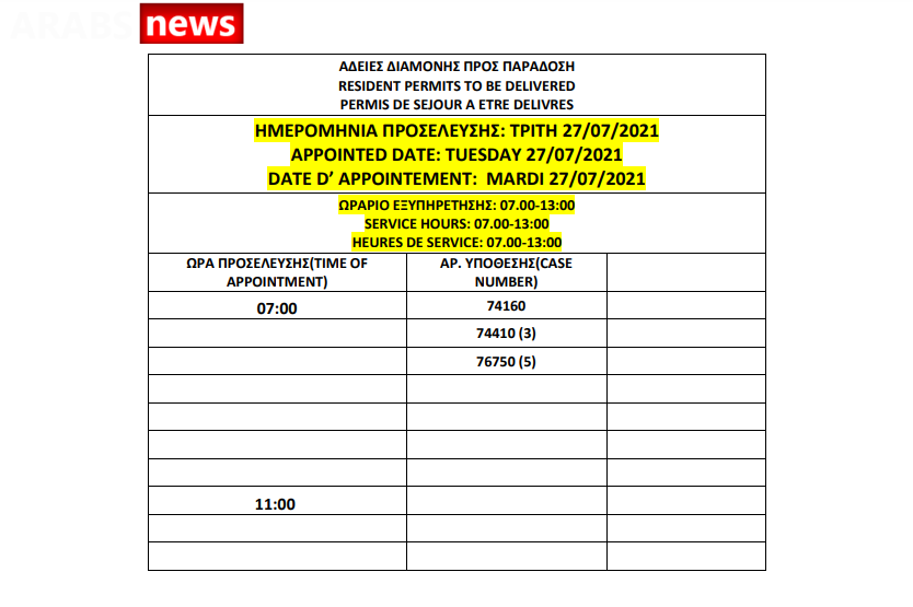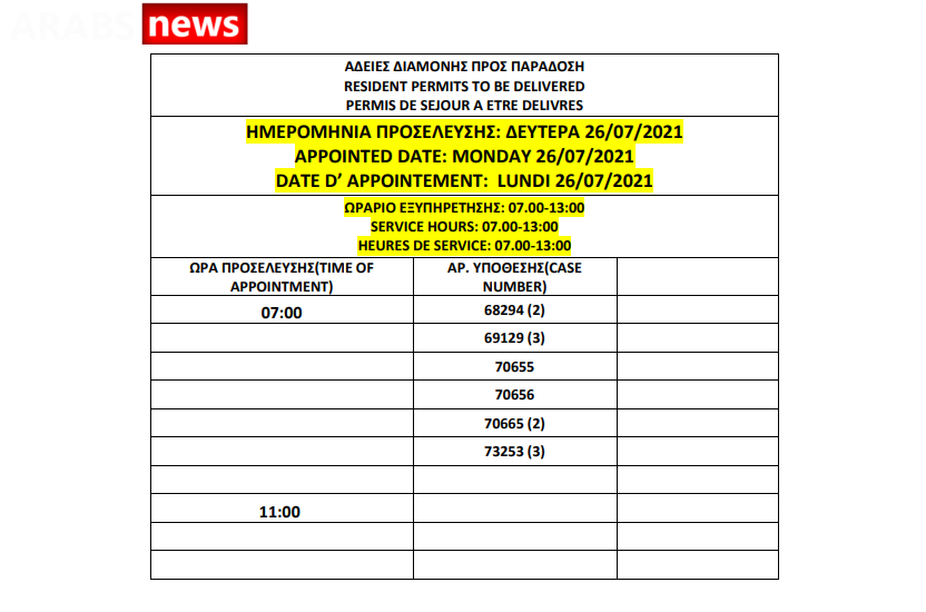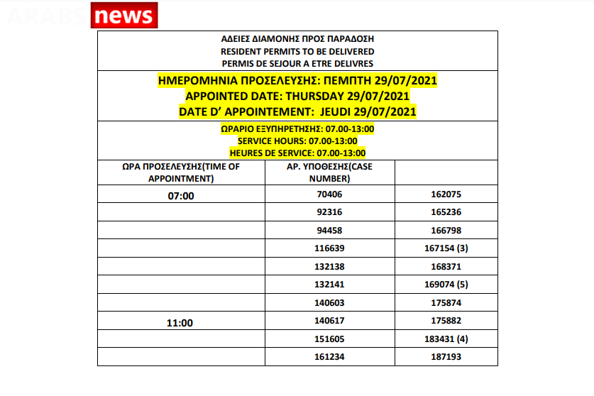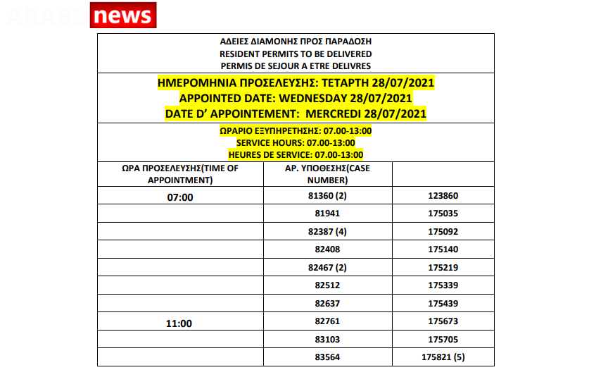 أصدرت وزارة الهجرة اليونانية اليوم الجمعة 23 يوليو أرقام الإقامات الجاهزة الخاصة بحالات اللجوء، على أن يتم تسليم الإقامات الجاهزة أيام 26 و27 و28 و29 و30 يوليو.