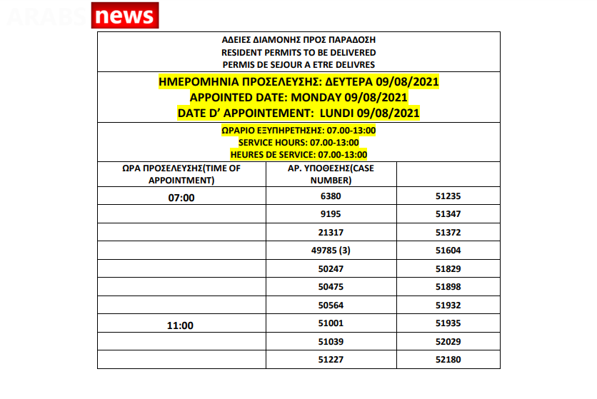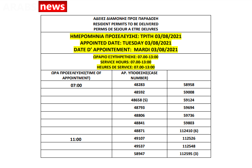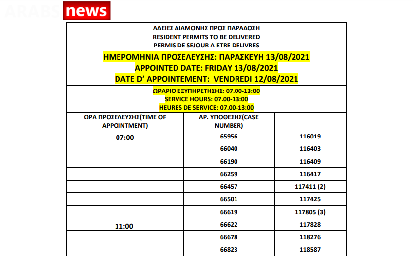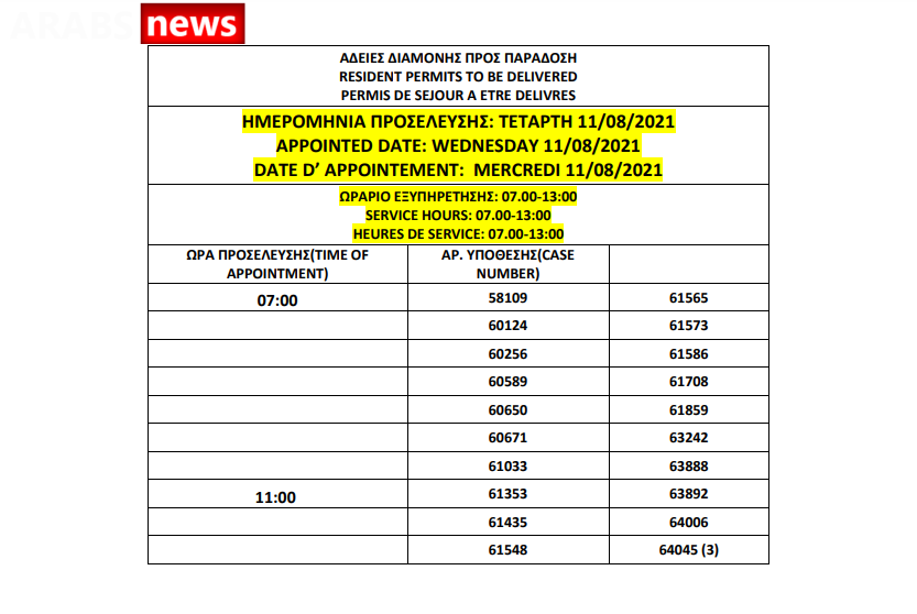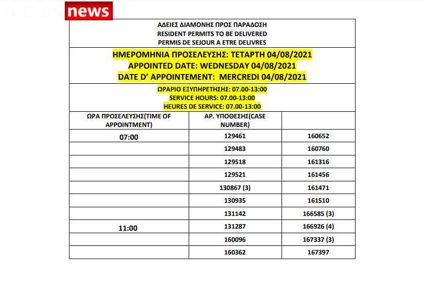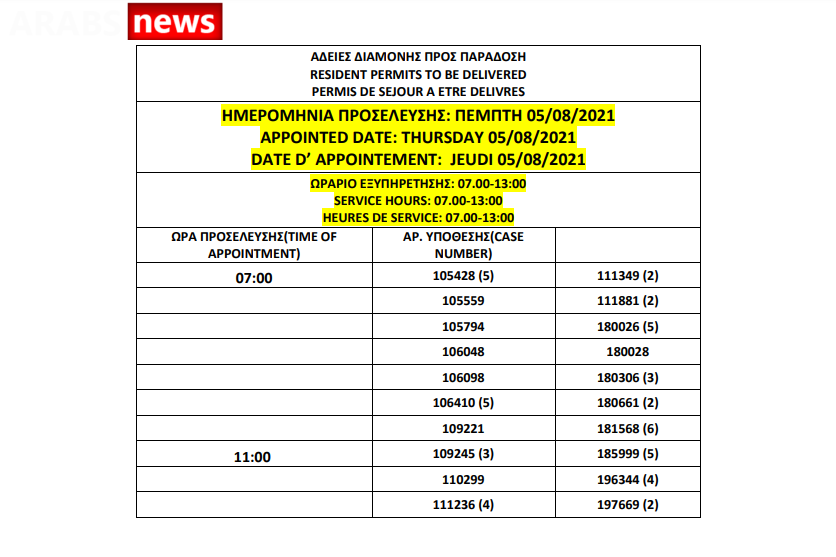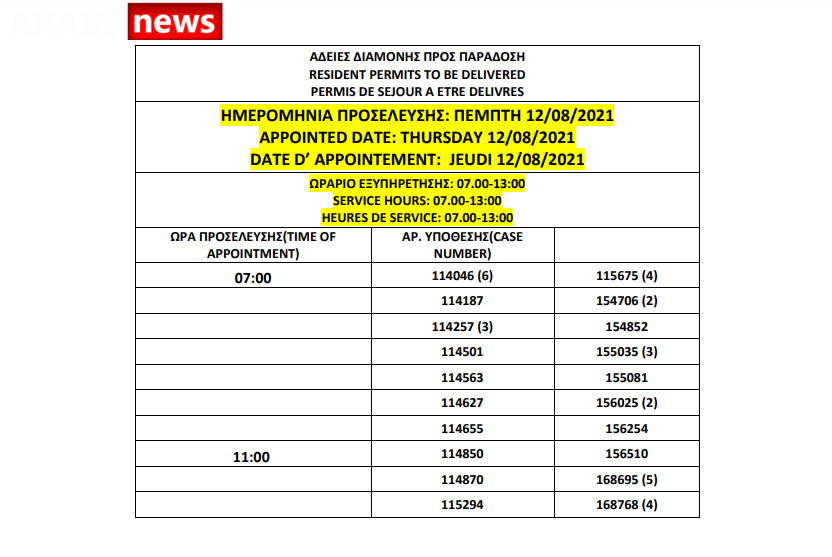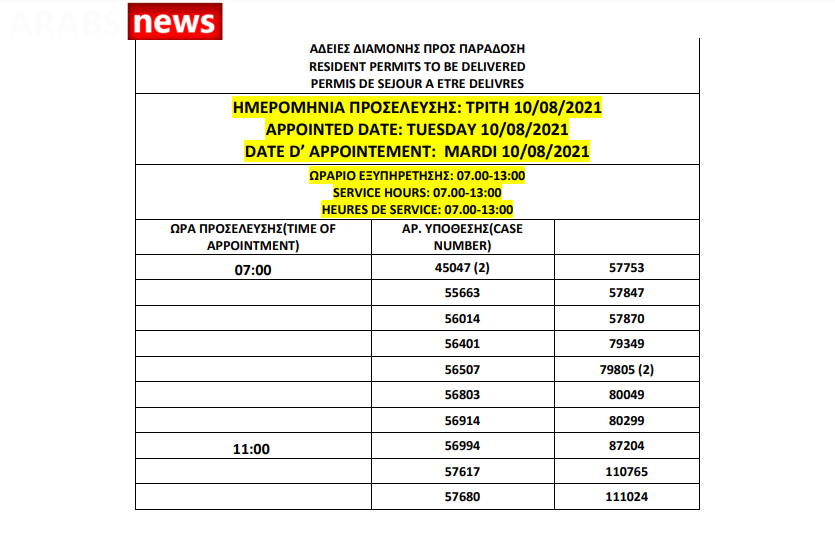 أصدرت وزارة الهجرة اليونانية في أثينا اليوم الجمعة 30 يوليو 2021، الإقامات الجاهزة الخاصة بحالات اللجوء، وسيتم تسليم الإقامات أيام 2 و3 و4 و5 و6 و9 و10 و11 و12 و13 أغسطس.