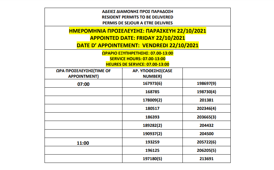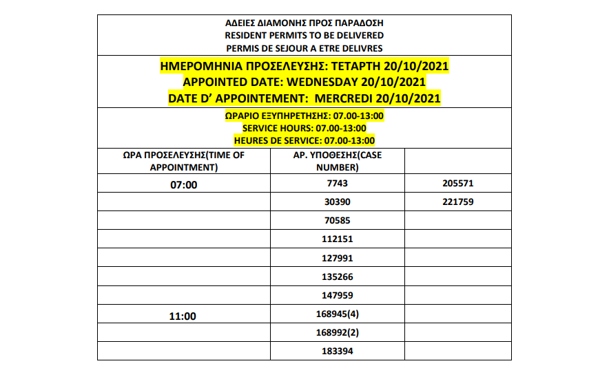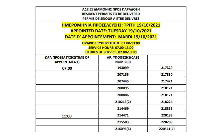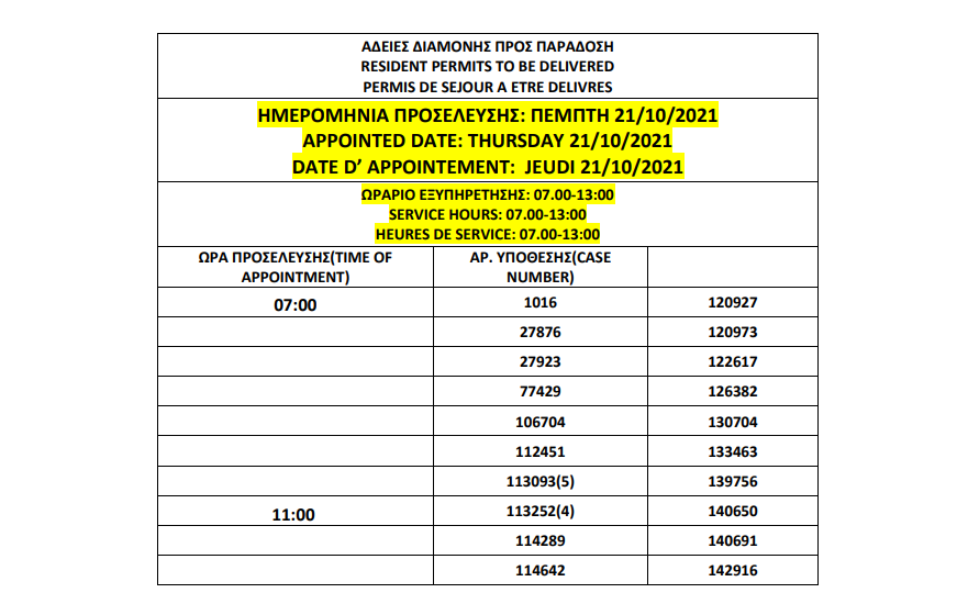 أصدرت وزارة الهجرة اليونانية اليوم الإثنين 18 أكتوبر 2021، أرقام الإقامات الجاهزة الخاصة بحالات اللجوء، على أن يتم تسليم الإقامات أيام 19 و20 و21 و22 أكتوبر.
