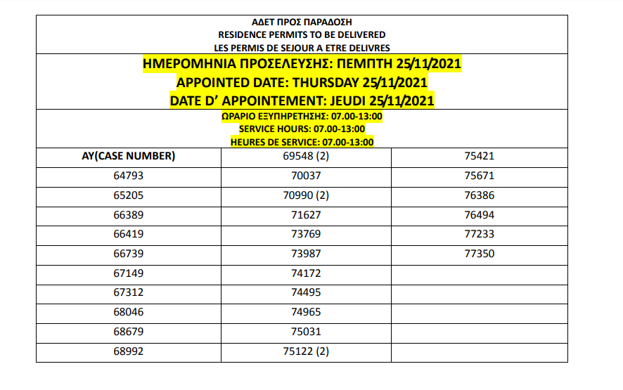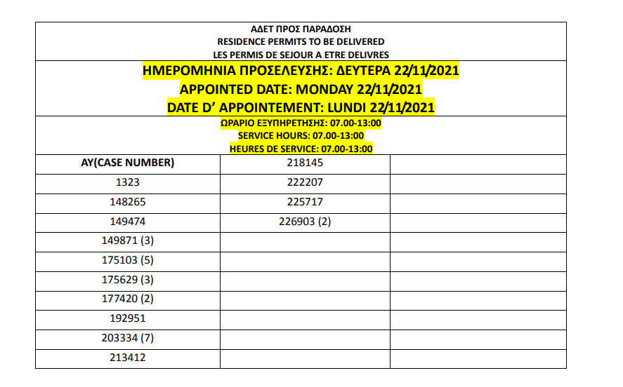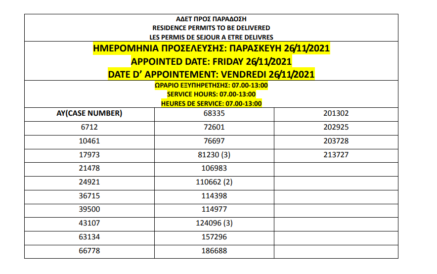 أصدرت وزارة الهجرة اليونانية في أثينا اليوم الجمعة 19 نوفمبر أرقام الإقامات الجاهزة الخاصة بحالات اللجوء، على أن يتم تسليم الإقامات أيام 22 و25 و26 نوفمبر.