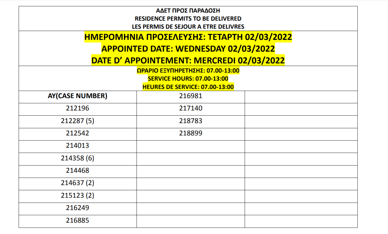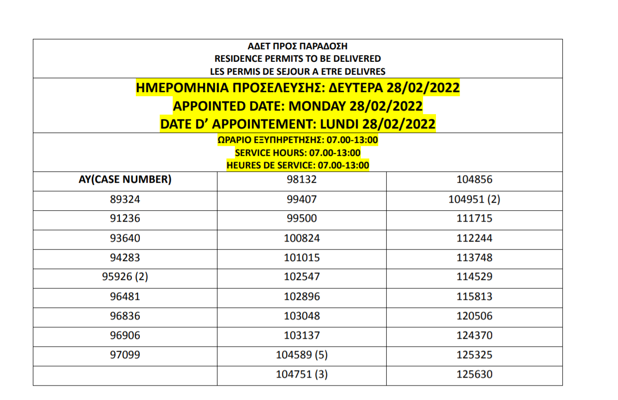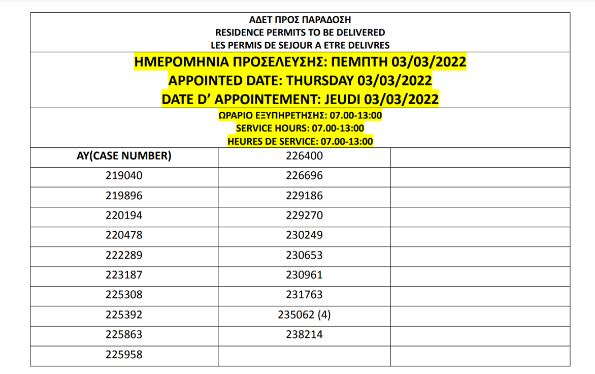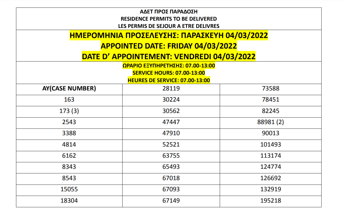 أصدرت وزارة الهجرة اليونانية في أثينا أرقام الإقامات الجاهزة الخاصة بحالات اللجوء بتاريخ 24 فبراير 2022، على أن يتم تسليم الإقامات أيام 28 فبراير و01 و02 و03 و04 مارس.