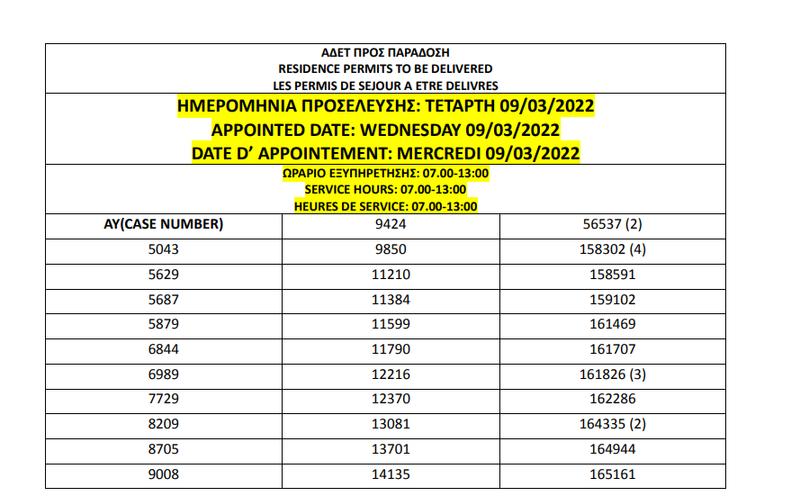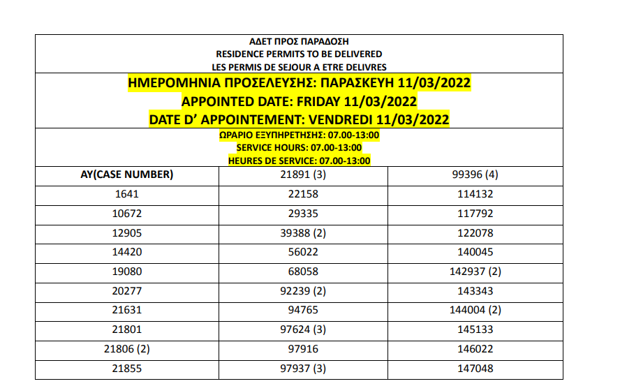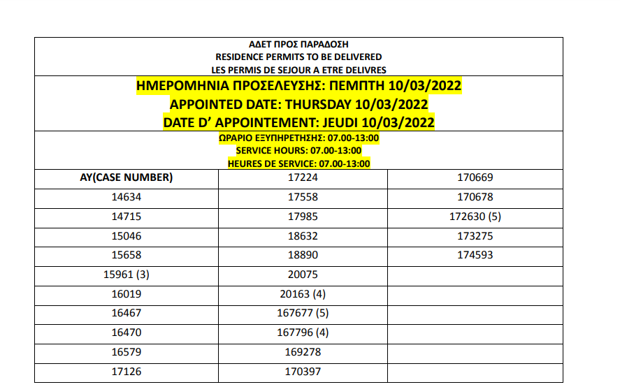 أصدرت وزارة الهجرة اليونانية في أثينا أرقام الإقامات الجاهزة الخاصة بحالات اللجوء بتاريخ 4 مارس 2022، على أن يتم تسليم الإقامات أيام 8 و9 و10 و11 مارس.