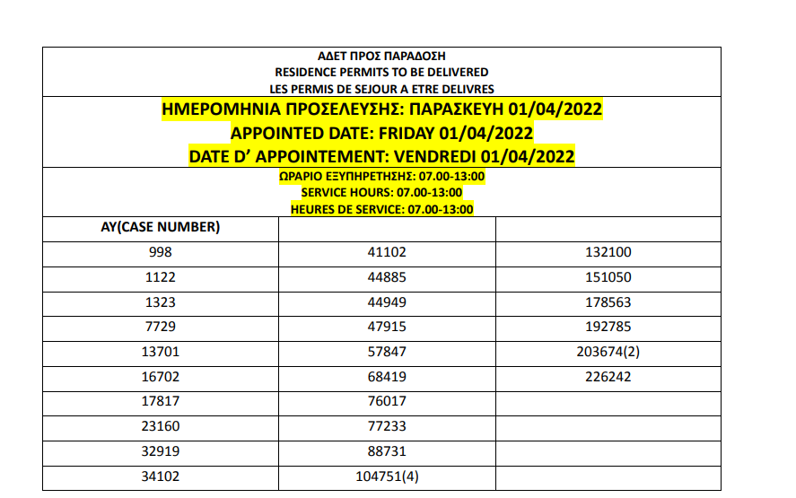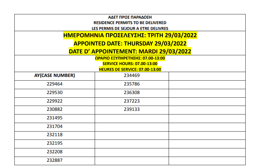 أصدرت وزارة الهجرة اليونانية في أثينا أرقام الإقامات الجاهزة الخاصة بحالات اللجوء بتاريخ 24 مارس 2022، على أن يتم تسليم الإقامات أيام 28 و29 مارس و1 أبريل.