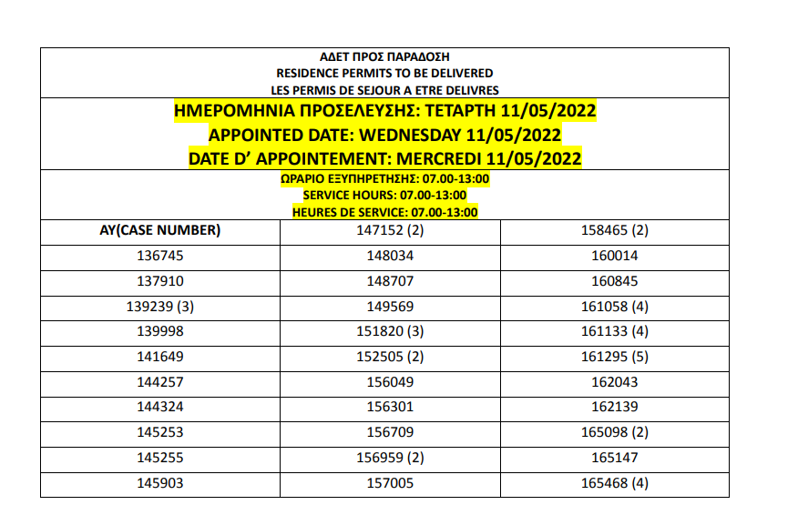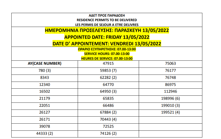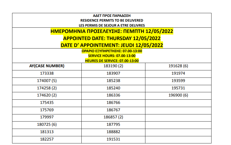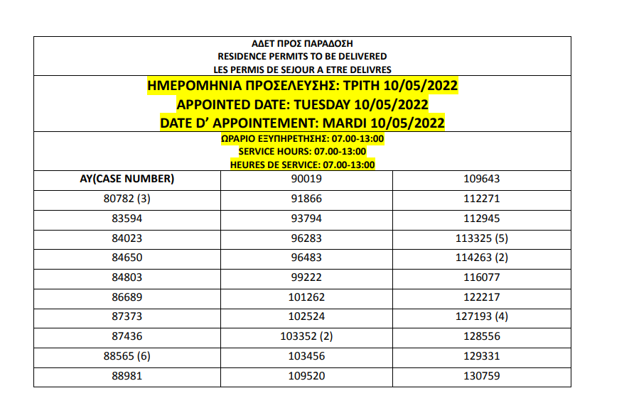 أصدرت وزارة الهجرة اليونانية في أثينا أرقام الإقامات الجاهزة الخاصة بحالات اللجوء بتاريخ 6 مايو 2022، على أن يتم تسليم الإقامات أيام 9 و10 و11 و12 و13 مايو.