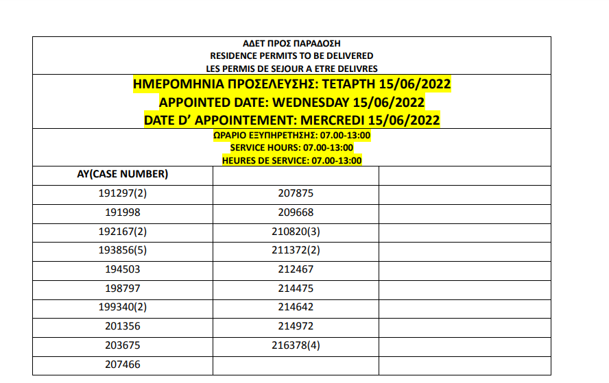 أصدرت وزارة الهجرة اليونانية في أثينا أرقام الإقامات الجاهزة الخاصة الخاصة بحالات اللجوء بتاريخ 10 يونيو 2022، على أن يتم تسليم الإقامات أيام 14 و15 و16 و17 يونيو.