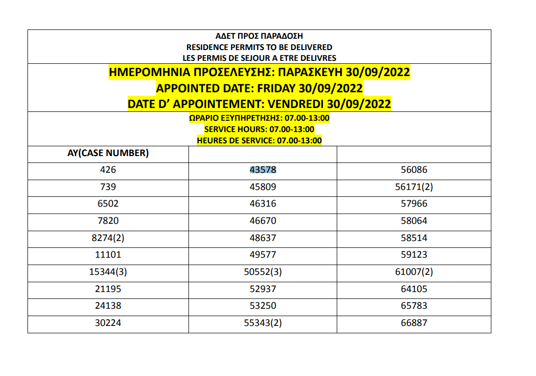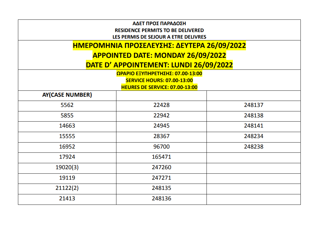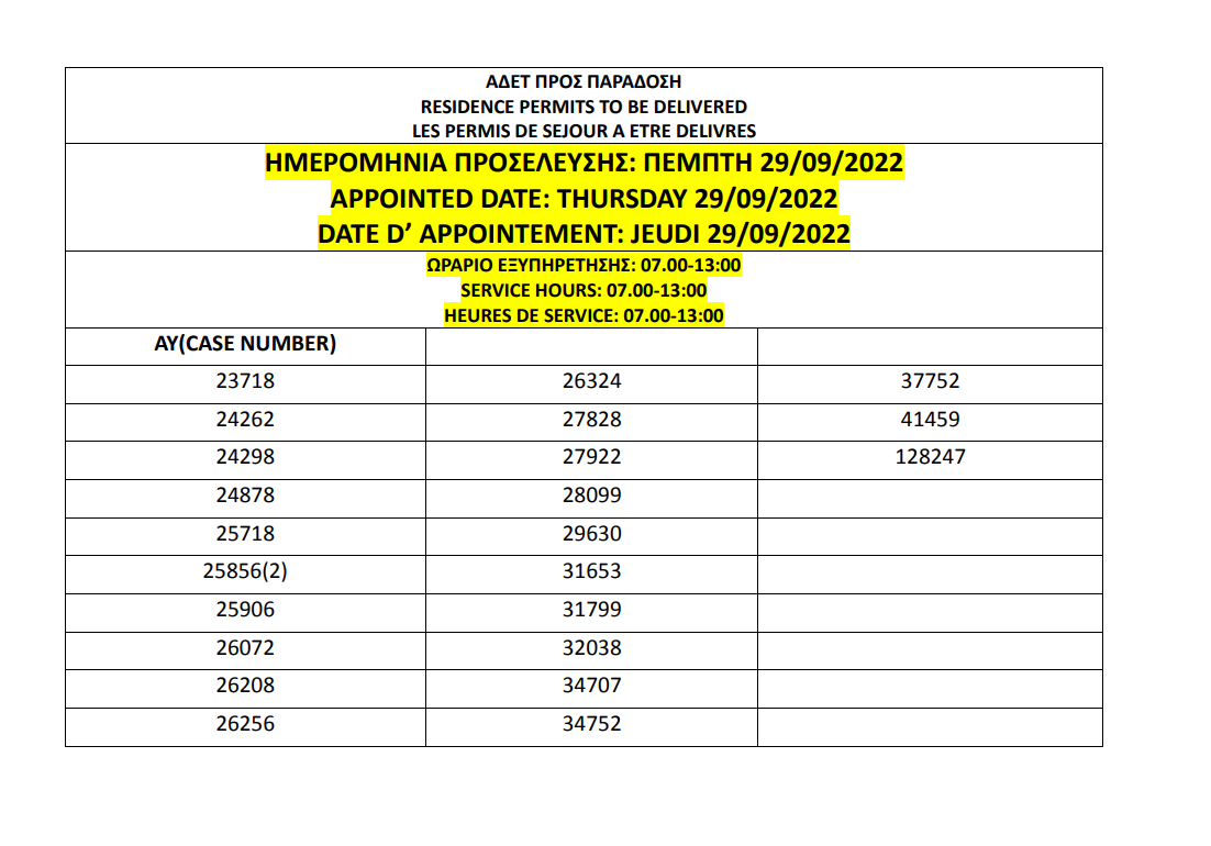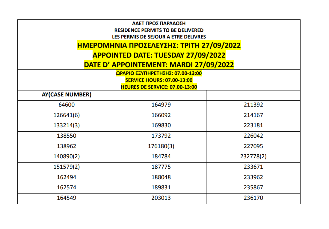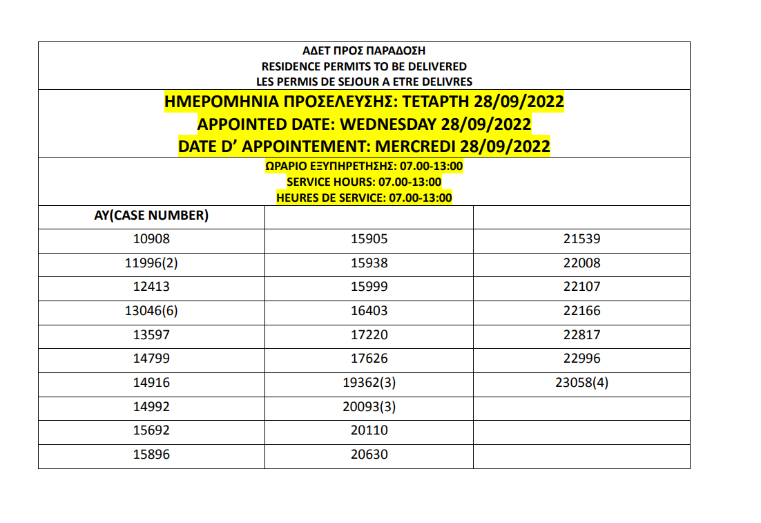 أصدرت وزارة الهجرة اليونانية في أثينا أرقام الإقامات الجاهزة الخاصة بحالات اللجوء بتاريخ 23 سبتمبر 2022، على أن يتم تسليم الإقامات أيام 26 و27 و28 و29 و30 سبتمبر.