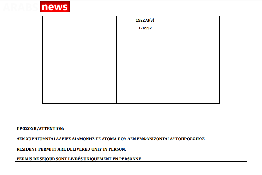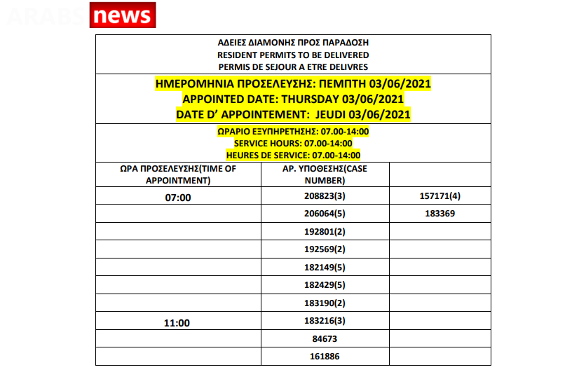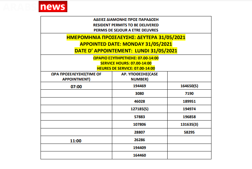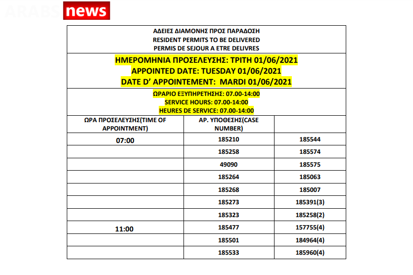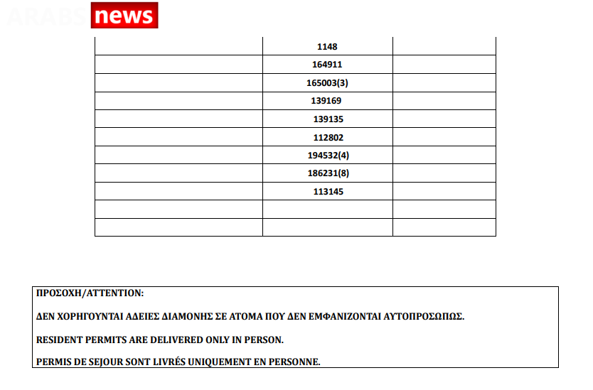 أصدرت دائرة الهجرة اليونانية في مدينة أثينا أرقام الإقامات الجاهزة الخاصة بحالات اللجوء بتاريخ 28 مايو 2021، وسيتم تسليم الإقامات أيام 31 مايو و1 و2 و3 و4 يونيو.