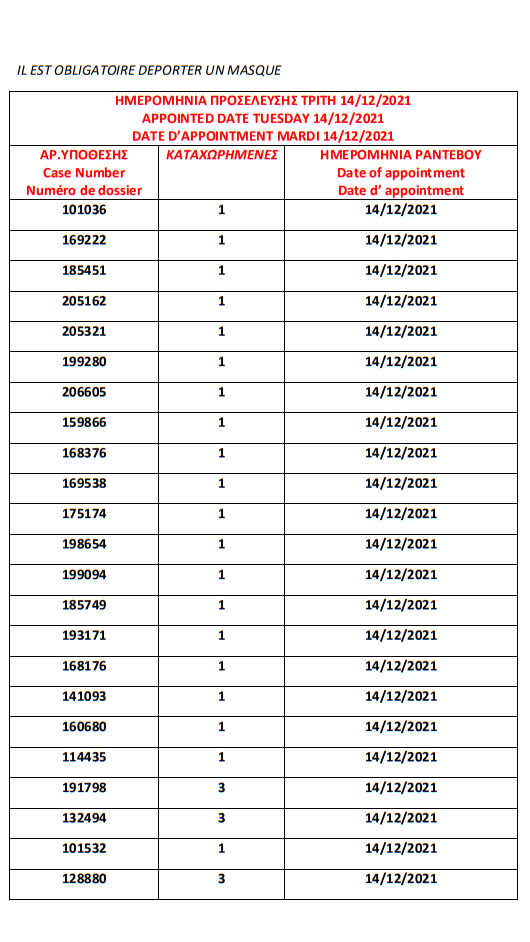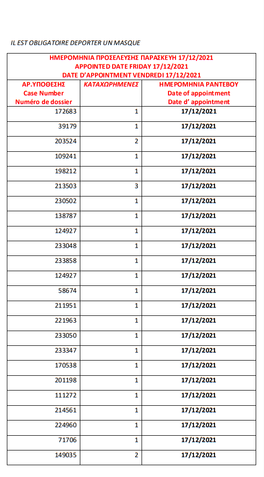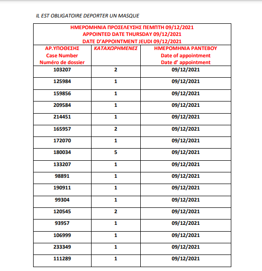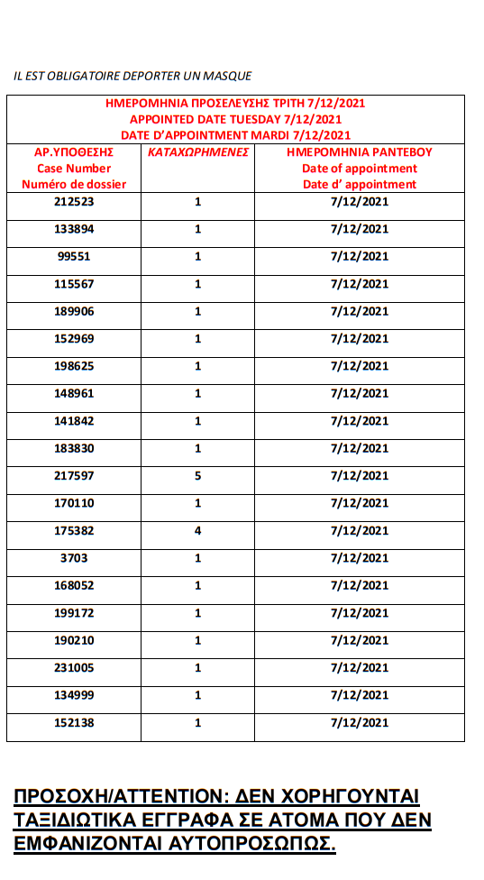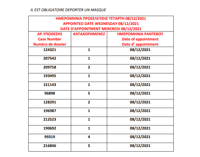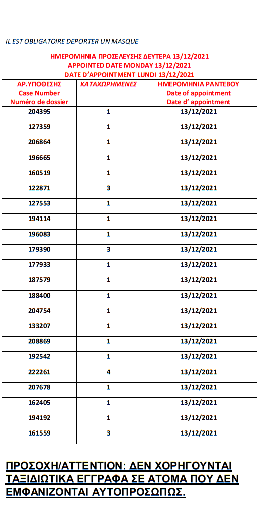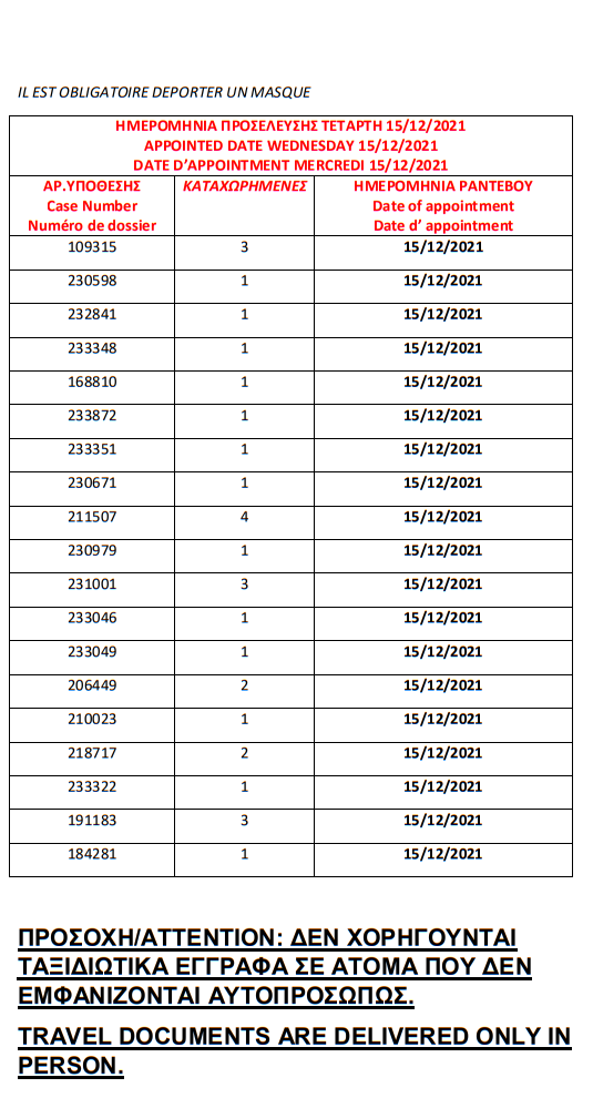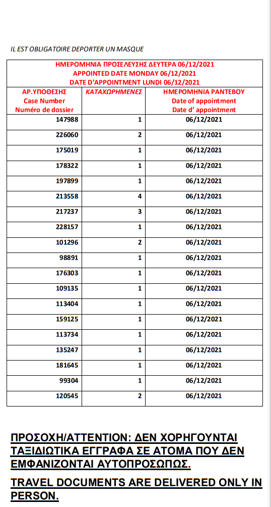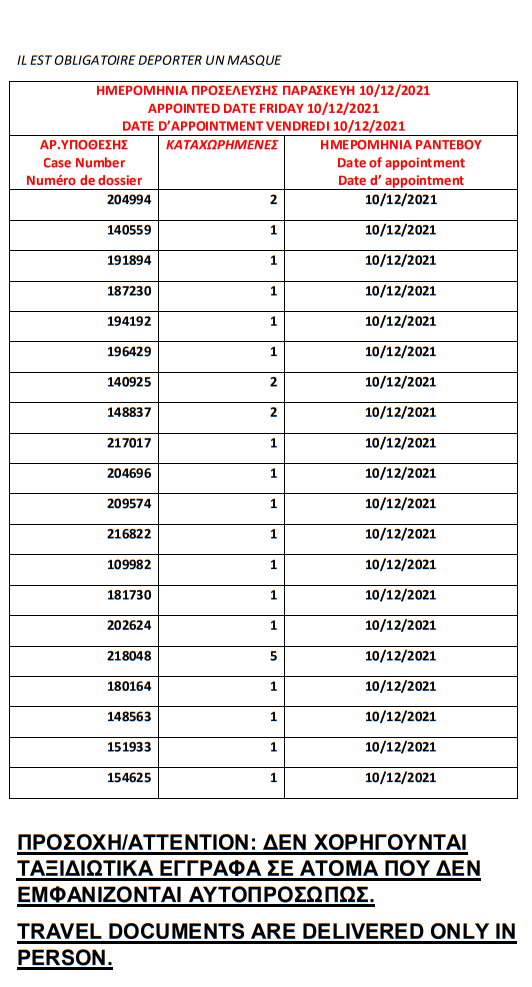 أصدرت وزارة الهجرة اليونانية في مدينة ثيسالونيكي يوم الأربعاء 1 ديسمبر أرقام الباسبورات الجاهزة الخاصة بحالات اللجوء، على أن يتم تسليم الجوازات أيام 6 و7 و8 و 9 و10 و13و14و15و16و17 ديسمبر.