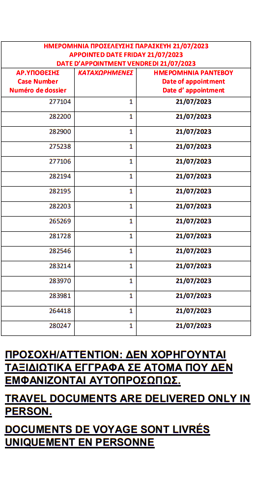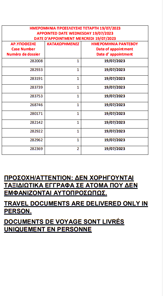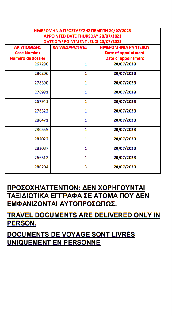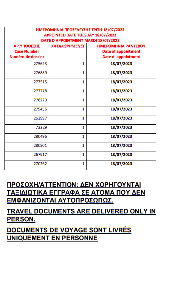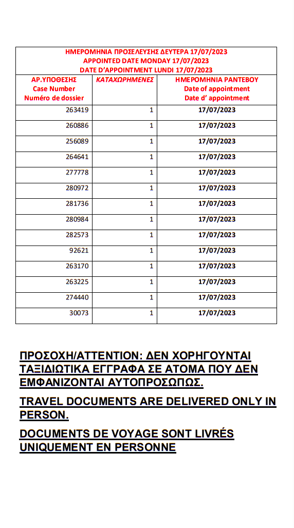 أصدرت وزارة الهجرة اليونانية في مدينة ثيسالونيكي الباسبورات الجاهزة الخاصة بحالات اللجوء بتاريخ 12 يوليو 2023، على أن يتم تسليم الجوازات أيام 17 و18 و19 و20 و21 يوليو.