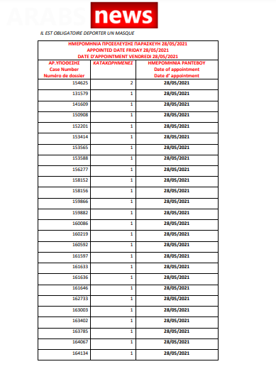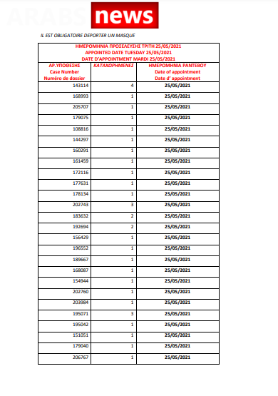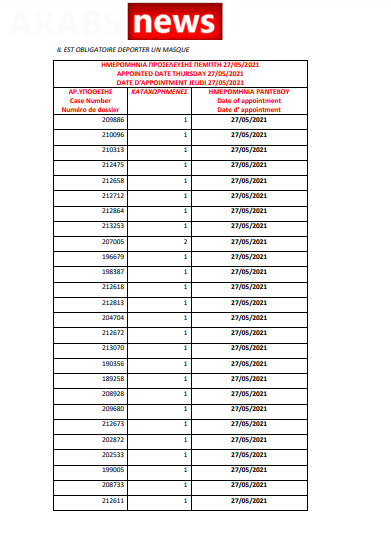 أصدرت دائرة اللجوء اليونانية في مدينة ثيسالونيكي اليوم الخميس 13 مايو 2021، أرقام الباسبورات الجاهزة الخاصة بحالات اللجوء، وسيتم تسليم الجوازات أيام 24 و25 و26 و27 و28 مايو.