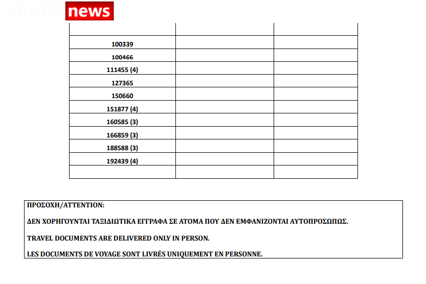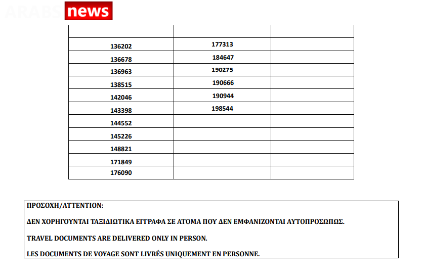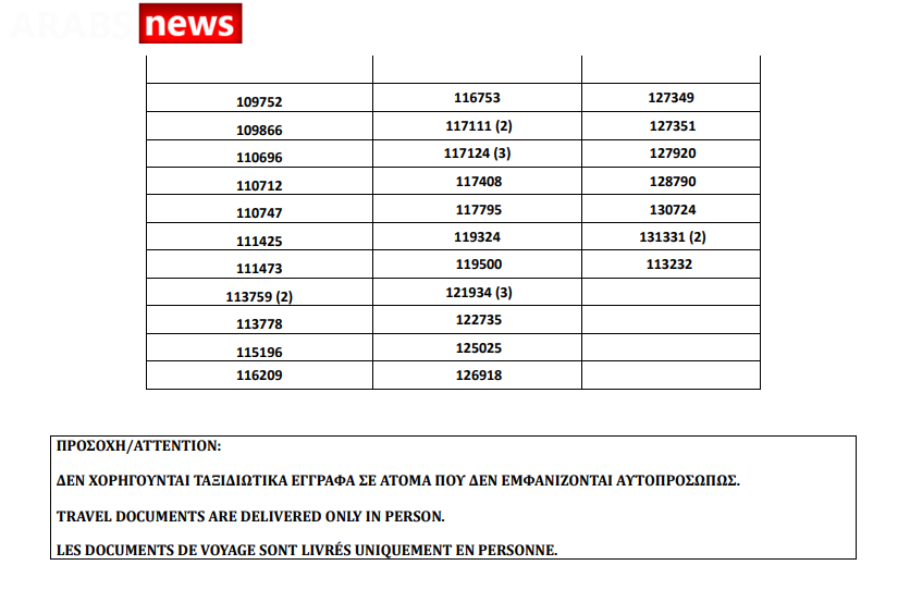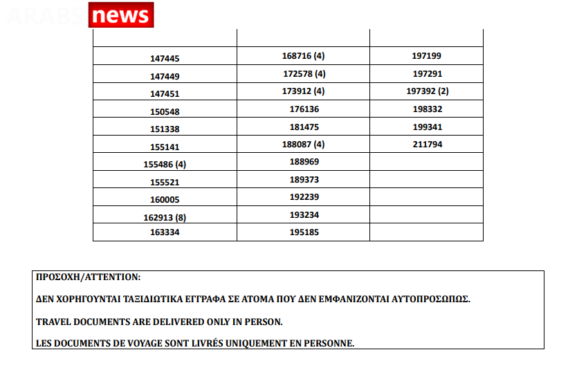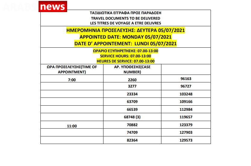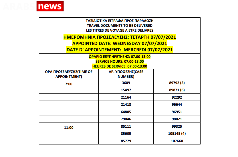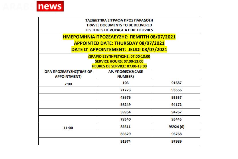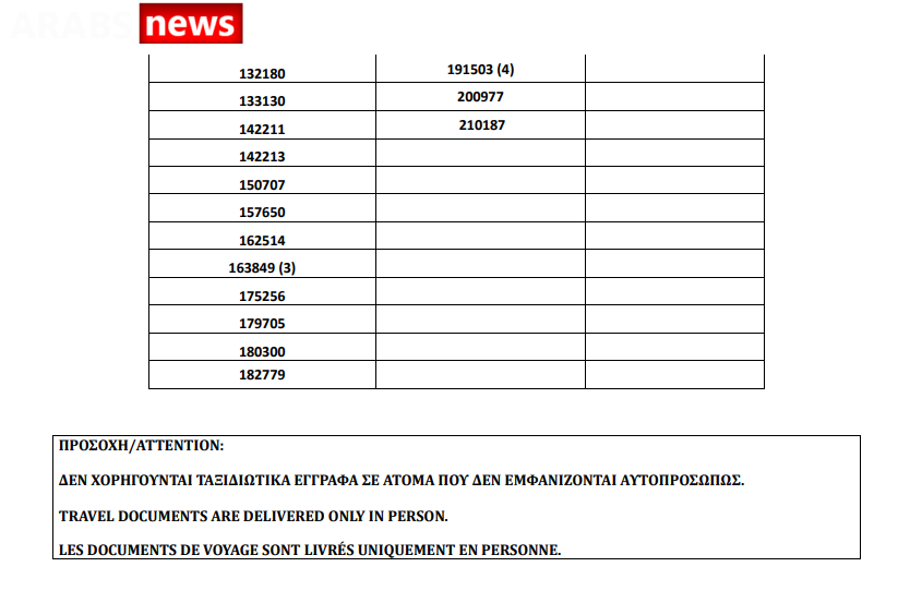 أصدرت دائرة الهجرة اليونانية في العاصمة أثينا أرقام الباسبورات الجاهزة الخاصة بحالات اللجوء بتاريخ 2 يوليو 2021، على أن يتم تسليم الباسبورات الجاهزة أيام 5 و6 و7 و8 و9 يوليو.