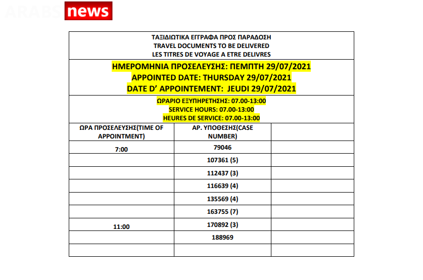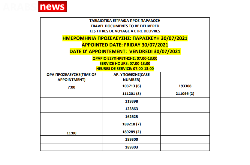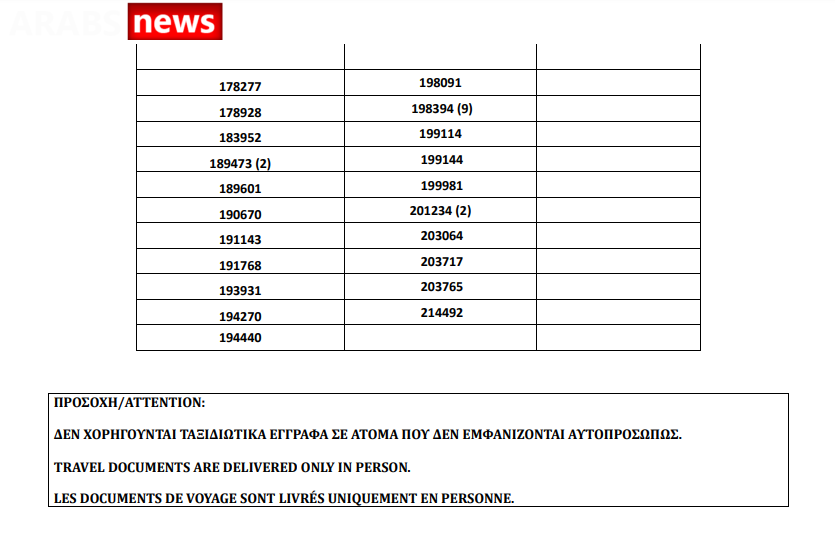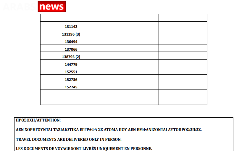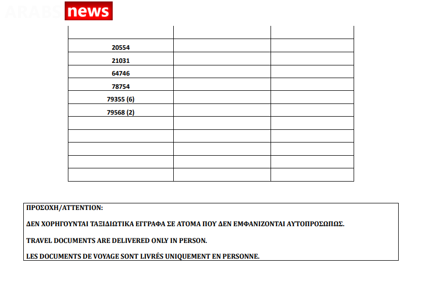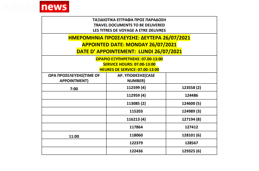 أصدرت وزارة الهجرة اليونانية اليوم الجمعة 23 يوليو أرقام الباسبورات الجاهزة الخاصة بحالات اللجوء، على أن يتم تسليم الجوازات الجاهزة أيام 26 و27 و28 و29 و30 يوليو.