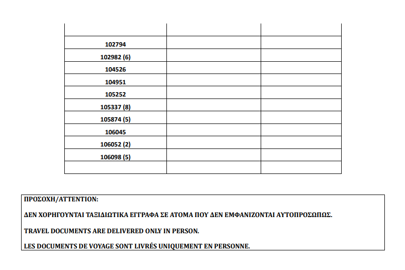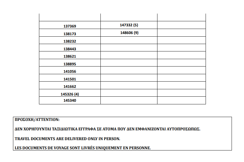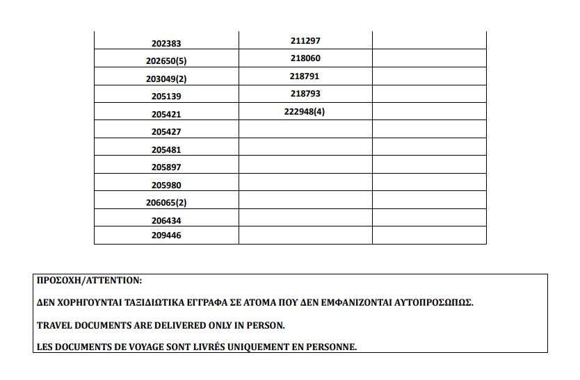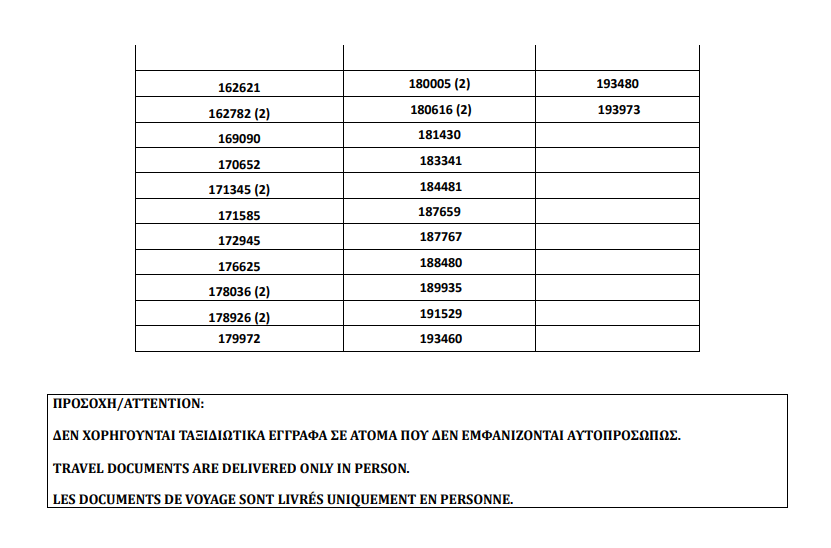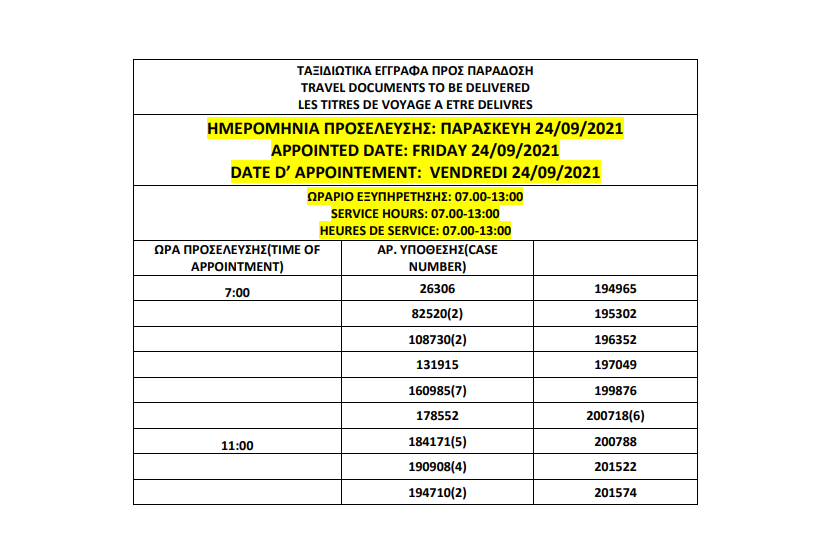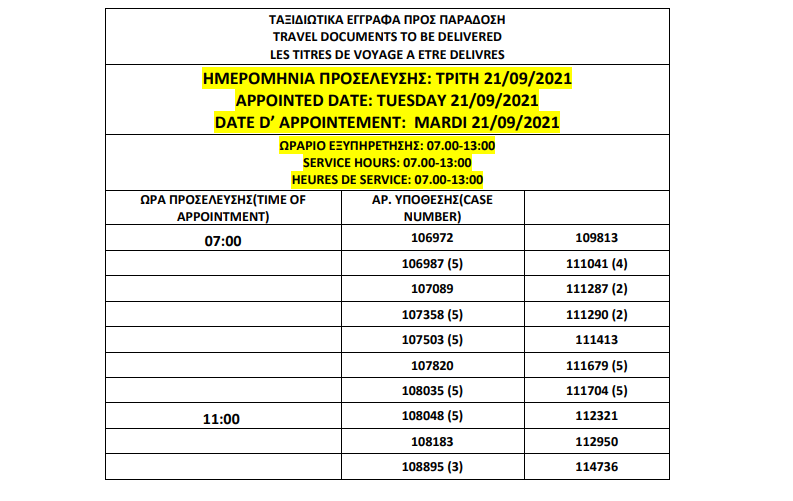 أصدرت وزارة الهجرة اليونانية في أثينا أرقام الباسبورات الجاهزة الخاصة بحالات اللجوء بتاريخ 17 سبتمبر 2021، على أن يتم تسليم الجوازات في أيام 20 و21 و22 و23 و24 سبتمبر.