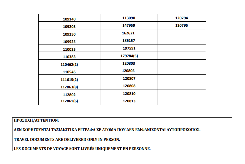 أصدرت وزارة الهجرة اليونانية في أثينا أرقام الباسبورات الجاهزة الخاصة بحالات اللجوء بتاريخ 8 أكتوبر 2021، على أن يتم تسليم الجوازات أيام 11 و12 و13 و14 و15 أكتوبر.