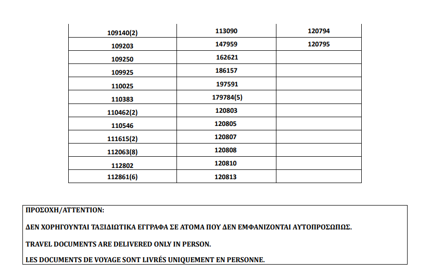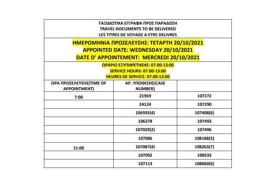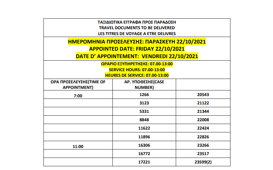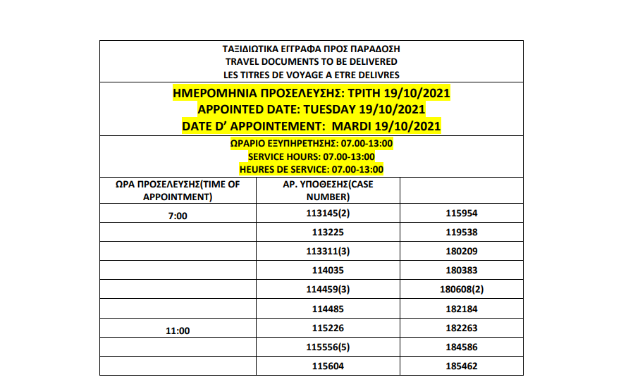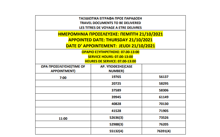 أصدرت وزارة الهجرة اليونانية في أثينا المواعيد الجديدة للباسبورات الجاهزة التي تم تأجيل استلامها الأسبوع الماضي بسبب الأحوال الجوية السيئة، على أن تكون أيام الاستلام 19 و20 و21 و22 أكتوبر.
