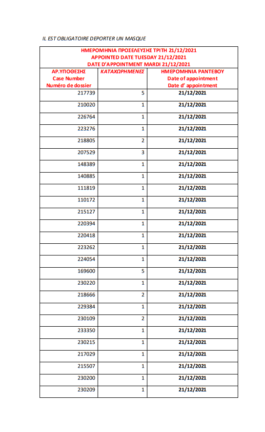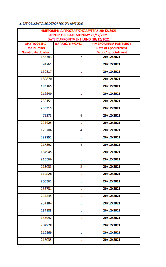 أصدرت وزارة الهجرة اليونانية اليوم الخميس 16 ديسمبر 2021، أرقام الباسبورات الجاهزة الخاصة بحالات اللجوء في ثيسالونيكي، على أن يتم تسليم الجوازات أيام 20 و21 و22 ديسمبر