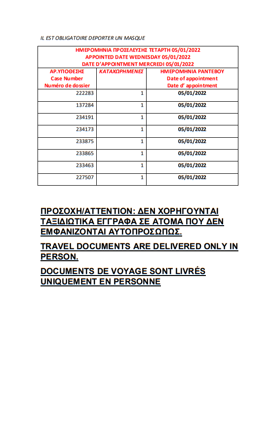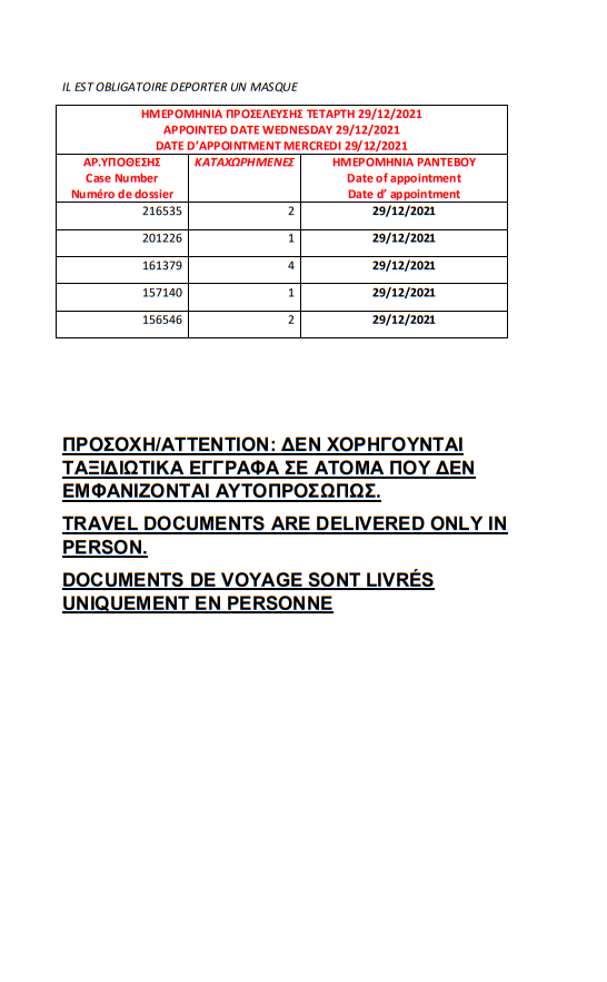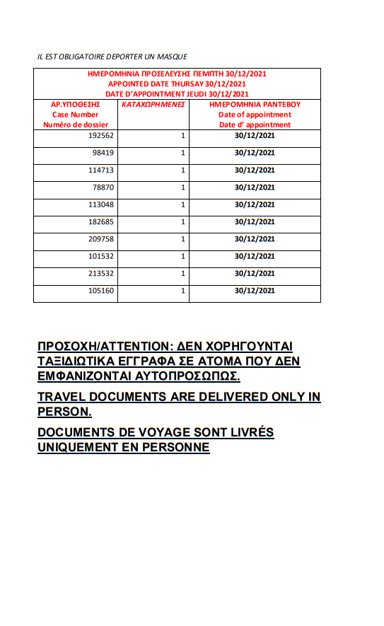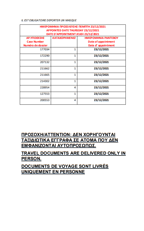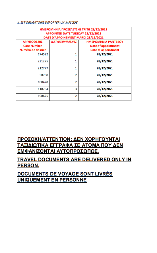 أصدرت وزارة الهجرة اليونانية في مدينة ثيسالونيكي أرقام الباسبورات الجاهزة الخاصة بحالات اللجوء بتاريخ 21 ديسمبر 2021، على أن يتم تسليم الجوازات أيام 23 و28 و29 و30 ديسمبر و4 و5 يناير.