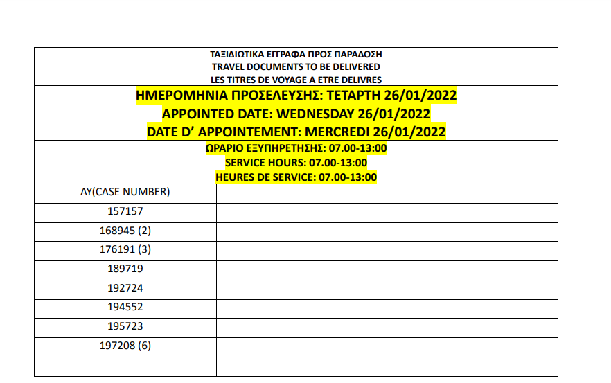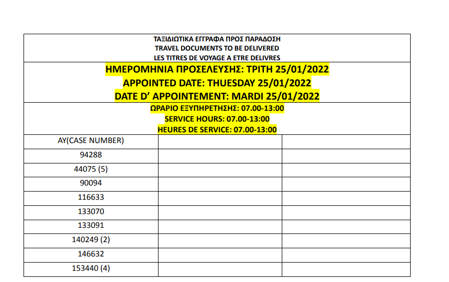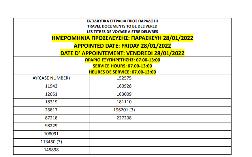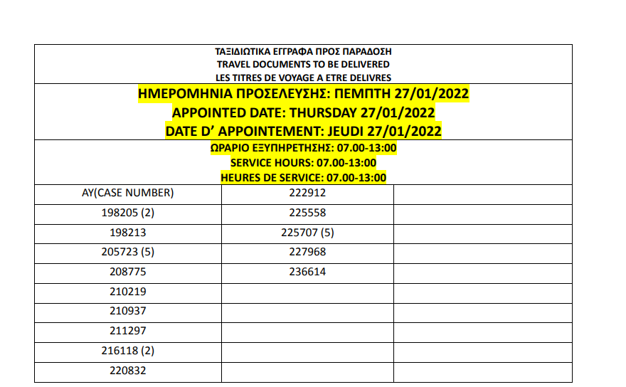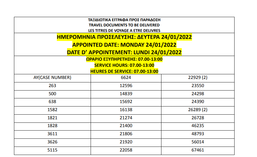 أصدرت وزارة الهجرة اليونانية في مدينة أثينا أرقام الباسبورات الجاهزة الخاصة بحالات اللجوء بتاريخ 20 يناير 2022، على أن يتم تسليم الجوازات أيام 24 و25 و26 و27 و28 يناير.