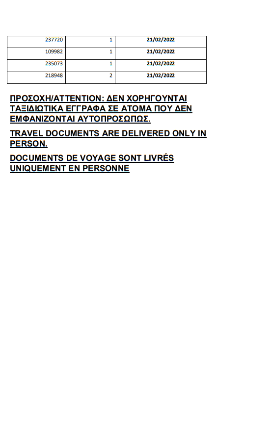 أصدرت وزارة الهجرة اليونانية في مدينة ثيسالونيكي أرقام الباسبورات الجاهزة الخاصة بحالات اللجوء بتاريخ 17 فبراير 2022، على أن يتم تسليم الجوازات أيام 21 و22 و23 و24 و25 فبراير.