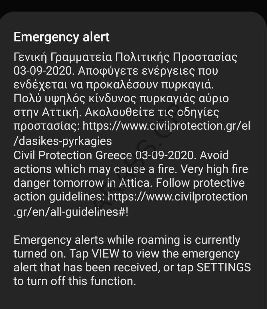 تلقى المواطنون في اليونان رسالة من الأمانة العامة للحماية المدنية عبر الرقم 112، حيث أبلغت الحماية المدنية عن ارتفاع خطر نشوب حرائق في إقليم أتيكي يوم غدٍ الجمعة.