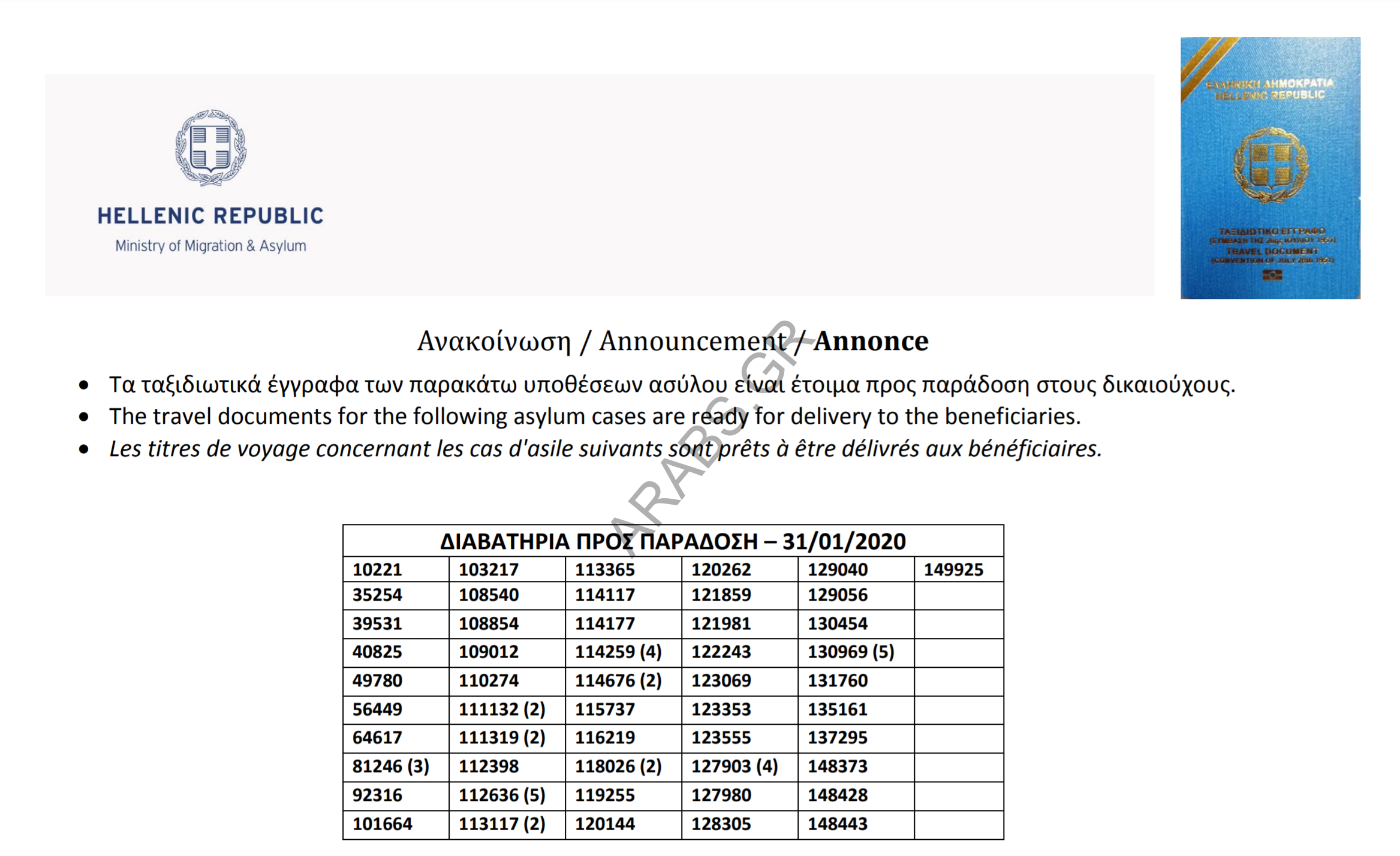 Home / هجرة / اليونان: أرقام الباسبورات الجاهزة الخاصة بحالات اللجوء بتاريخ 31/ 01/ 2020أخبار اللاجئيناللجوء في اليوناناليونانهجرةاليونان: أرقام الباسبورات الجاهزة الخاصة بحالات اللجوء بتاريخ 31/ 01/ 2020January 31, 2020 أرقام الباسبورات الجاهزة الخاصة بحالات اللجوء بتاريخ 31/ 01/ 2020. أرقام الباسبورات الجاهزة الخاصة . Arabs.gr Leave a comment Share this ArticleTagged:أرقام الباسبورات الجاهزةPrevious Article“الخروج الكبير”.. اليوم تدير بريطانيا ظهرها إلى أوروباNext Articleآخر تطورات فيروس “كورونا” في كل أنحاء العالمOmar Related Posts زيادة في تدفقات الهجرة في جزيرة كريت: ٣٦٩ وافداً خلال يومين April 14, 2026 إنقاذ ٥٧ مهاجراً غير شرعي جنوب جزيرة كريت و اعتقال مهربين اثنين م ... April 13, 2026 تفكيك شبكة تهريب مهاجرين في ساموس و اعتقال خمسة أشخاص April 5, 2026 Leave a ReplyYour email address will not be published. Required fields are marked *CommentName Email Website