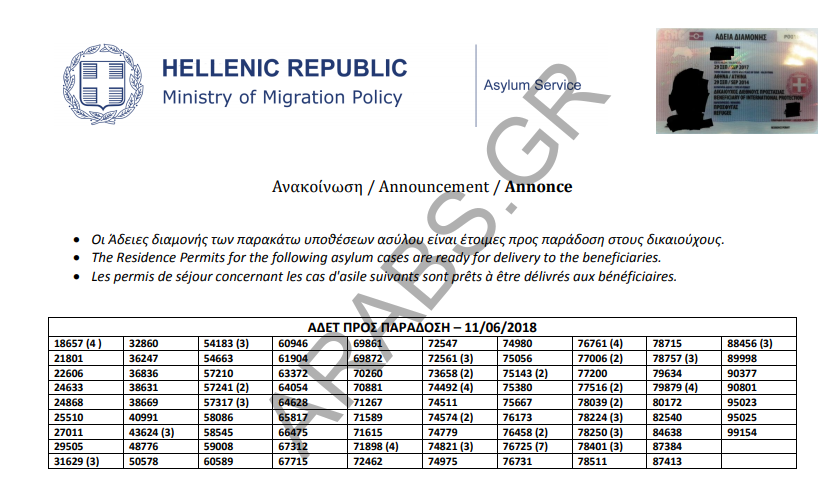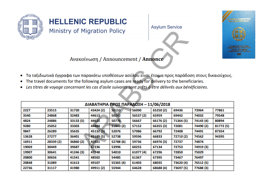 اليونان : أرقام الباسبورات وتصاريح الإقامات الجاهزة الخاصة بحالات اللجوء بتاريخ 2018/06/11.