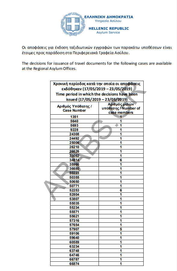 أرقام الموافقات على الباسبورات الخاصة بحالات اللجوء بتاريخ 2019/05/24.