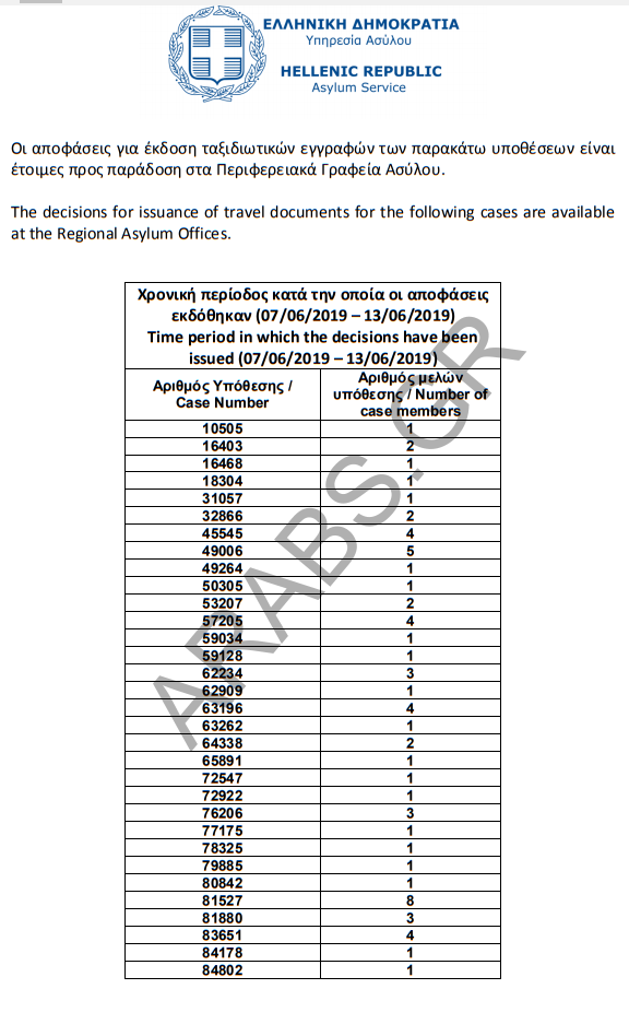 أرقام الموافقات على الباسبورات الخاصة بحالات اللجوء بتاريخ 2019/06/14.