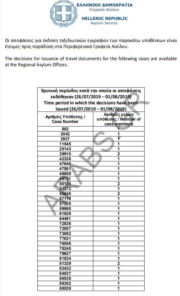 اليونان : أرقام الموافقات على الباسبورات الخاصة بحالات اللجوء بتاريخ 2019/08/01