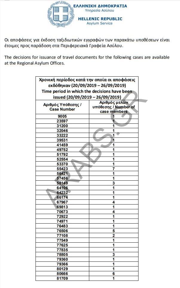 اليونان : أرقام الموافقات على الباسبورات الخاصة بحالات اللجوء بتاريخ 2019/09/27