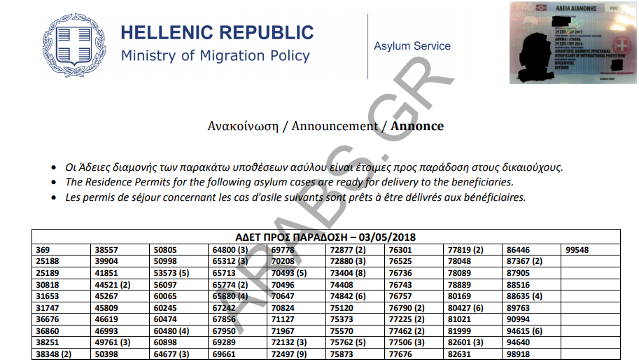 Home / اليونان / اليونان : أرقام تصاريح الإقامة الجاهزة الخاصة بحالات اللجوء بتاريخ 2018/05/03.أخبار اللاجئيناليوناناليونان : أرقام تصاريح الإقامة الجاهزة الخاصة بحالات اللجوء بتاريخ 2018/05/03.May 3, 2018 أرقام تصاريح الإقامة الجاهزة الخاصة بحالات اللجوء بتاريخ 2018/05/03. Arabs.gr Leave a comment Share this ArticlePrevious Articleاليونان : أرقام الباسبورات الجاهزة الخاصة بحالات اللجوء بتاريخ 2018/05/03.Next Articleاليونان : منظمة أطباء بلا حدود تدعو إلى النقل الفوري للاجئين إلى البر اليونانيOmar Related Posts زيادة في تدفقات الهجرة في جزيرة كريت: ٣٦٩ وافداً خلال يومين April 14, 2026 إنقاذ ٥٧ مهاجراً غير شرعي جنوب جزيرة كريت و اعتقال مهربين اثنين م ... April 13, 2026 تفكيك شبكة تهريب مهاجرين في ساموس و اعتقال خمسة أشخاص April 5, 2026