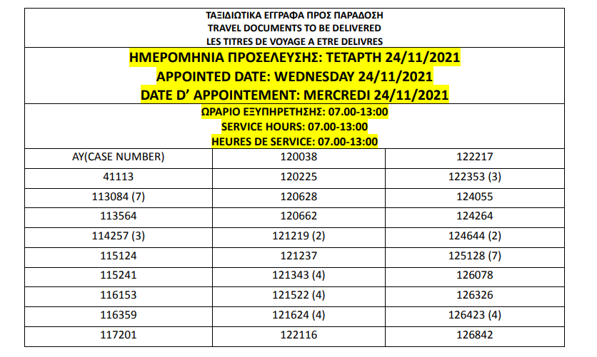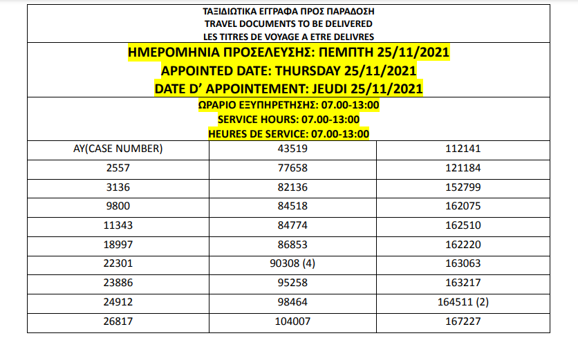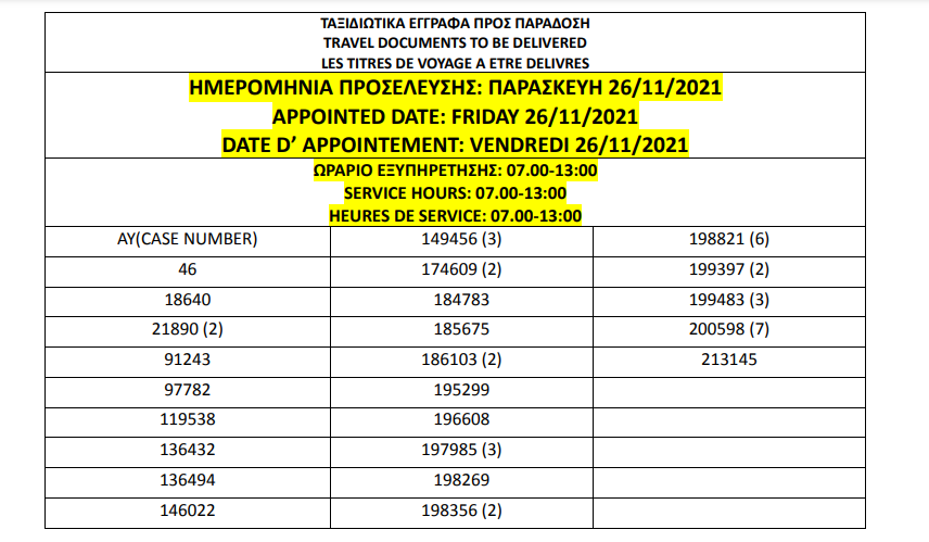 أصدرت وزارة الهجرة اليونانية في أثينا اليوم الجمعة 19 نوفمبر 2021، أرقام الباسبورات الجاهزة الخاصة بحالات اللجوء، على أن يتم تسليم الجوازات أيام 22 و23 و24 و25 و26 نوفمبر.