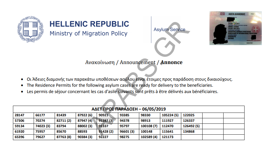 اليونان : تصاريح الإقامة الجاهزة الخاصة بحالات اللجوء بتاريخ 2019/05/06.