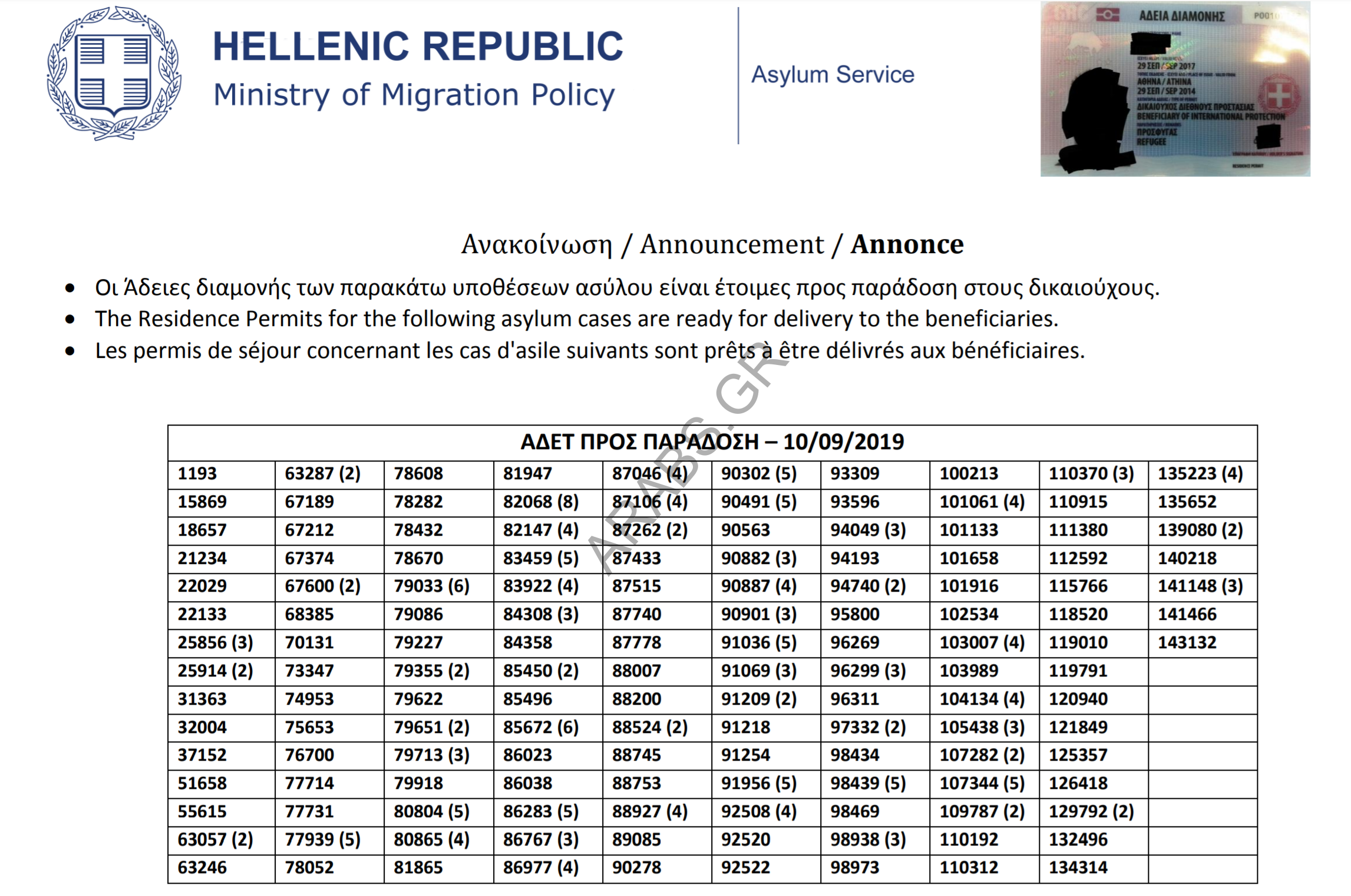 Home / هجرة / اليونان : تصاريح الإقامة الجاهزة الخاصة بحالات اللجوء بتاريخ 2019/09/10أخبار اللاجئيناليونانهجرةاليونان : تصاريح الإقامة الجاهزة الخاصة بحالات اللجوء بتاريخ 2019/09/10September 10, 2019 تصاريح الإقامة الجاهزة الخاصة بحالات اللجوء بتاريخ 2019/09/10. تصاريح الإقامة الجاهزة الخاصة بحالات اللجوء بتاريخ 2019/09/10 Arabs.gr Leave a comment Share this ArticleTagged:تصاريح الإقامة الجاهزةPrevious Articleالسلطات اليونانية تحتجز قارباً شراعياً كان يحمل مهاجرين في طريقهم إلى إيطالياNext Articleاليونان : أرقام الباسبورات الجاهزة الخاصة بحالات اللجوء بتاريخ 2019/09/10Omar Related Posts زيادة في تدفقات الهجرة في جزيرة كريت: ٣٦٩ وافداً خلال يومين April 14, 2026 إنقاذ ٥٧ مهاجراً غير شرعي جنوب جزيرة كريت و اعتقال مهربين اثنين م ... April 13, 2026 تفكيك شبكة تهريب مهاجرين في ساموس و اعتقال خمسة أشخاص April 5, 2026 Leave a ReplyYour email address will not be published. Required fields are marked *CommentName Email Website