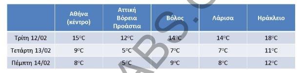 كما يتوقع خبراء هيئة الأرصاد الجوية هطول الثلوج في مختلف ضواحي أثينا و تحديدا في الضواحي الشمالية و الشرقية، من المتوقع ألا تتجاوز درجة الحرارة غدا الأربعاء في وسط أثينا 6 درجات ، وفي ثيسالونيكي 6 درجات.