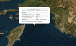 وقع زلزال بقوة ٣.٤ درجة على مقياس ريختر اليوم الخميس عند الساعة ١٧:٤٥ في المنطقة البحرية قبالة جزيرة رودس و كان مركز الزلزال بحسب معلومات معهد الجيوديناميكية يقع على بعد ٢٥ كيلومترا شرق رودس في حين قدر العمق البؤري بـ ٥٥.٨ كيلومترا.