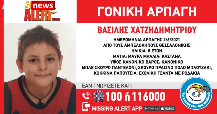 “هذا فاسيليس هادجيديميتريو البالغ من العمر 8 سنوات، له شعر بني وعينان سوداوان وطول ووزن طبيعي، وفي اليوم الذي اختفى فيه كان يرتدي سروالاً أزرق داكن وقميص بولو أخضر غامق وحذاء أحمر وحقيبة مدرسية بعجلات”.