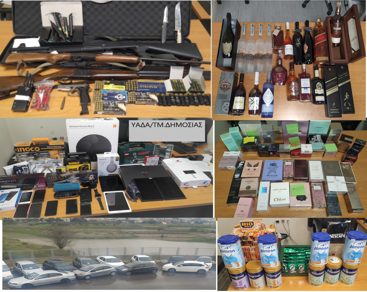 وبتفتيش مساكن المتهمين تم العثور على مسدس و3 بنادق و281 خرطوش من عيارات مختلفة وسكينتين وجهاز اتصال لاسلكي و22 مفرقعة ومبلغ 2500 يورو وعدد من الملابس عليها ملصقات وأحذية رياضية وأجهزة إلكترونية وأدوات كهربائية بالإضافة إلى 6 مركبات.