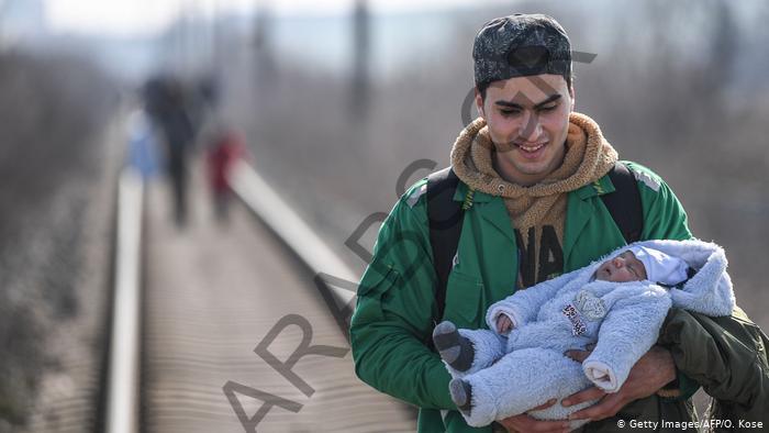 أب يعبر من تركيا إلى اليونان، ويبدو محتضنا فلذة كبده، في مشهد مؤثر ويختزل الوضع الإنساني المرير الذي يعانيه آلاف اللاجئين الهاربين نحو المجهول بين حدود تركيا واليونان.