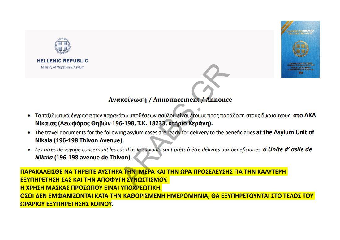 أصدرت دائرة اللجوء اليونانية اليوم الخميس 18 يونيو 2020، أرقام جوازات السفر الجاهزة للتسليم، وسيتم تسليم الجوازات يوم الأثنين 22 يونيو، حيث سيتم تسليم كل جواز سفر بحسب الساعة الموضحة في المرفق المنشور داخل الخبر.