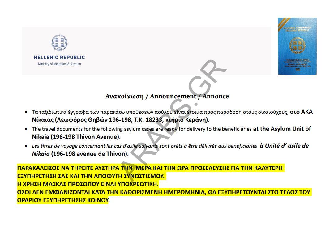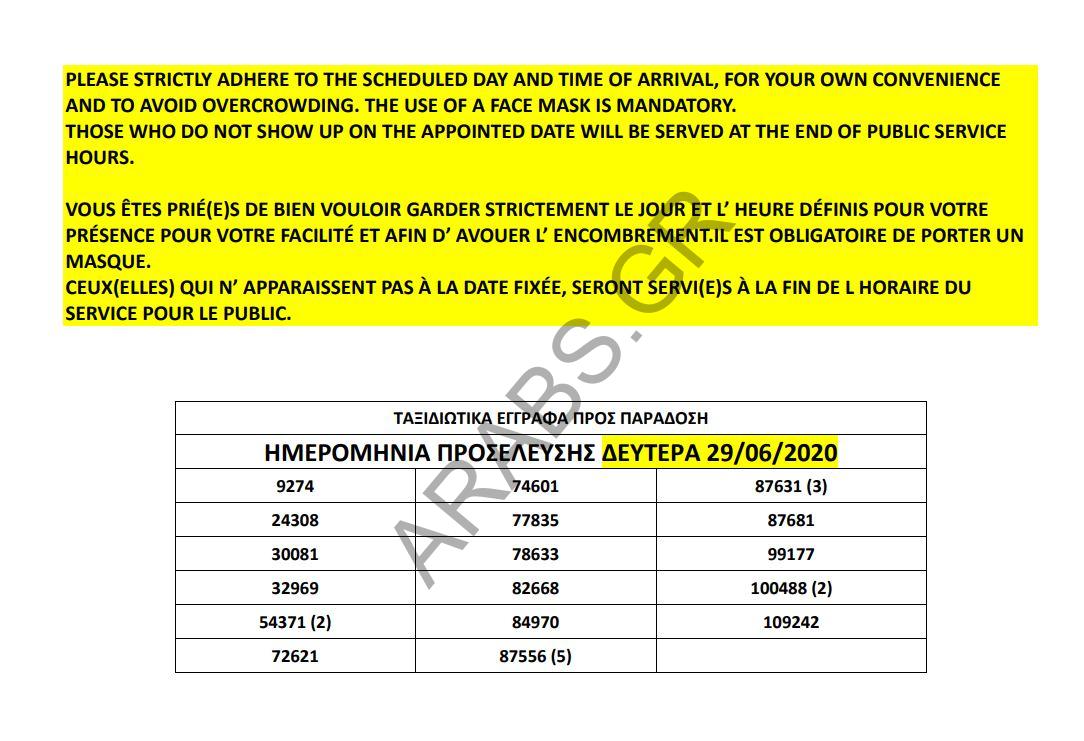 أصدرت دائرة اللجوء اليونانية اليوم الخميس 25 يونيو 2020، أرقام جوازات السفر الجاهزة للتسليم، وسيتم تسليم الجوازات يوم الإثنين المقبل الموافق 29 يونيو 2020.