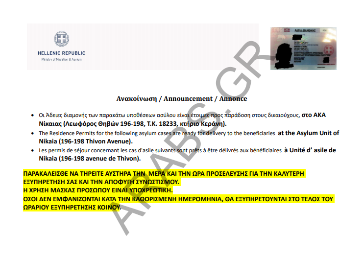 أصدرت دائرة اللجوء اليونانية اليوم الأربعاء أرقام تصاريح الإقامات الجاهزة الخاصة بحالات اللجوء، وسيتم تسليم الإقامات يوم غد الخميس الموافق 6/8/2020.