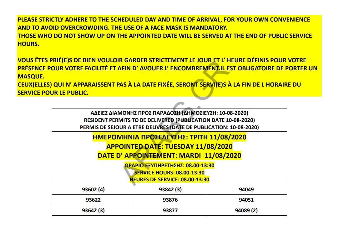 أصدرت دائرة اللجوء اليونانية اليوم الإثنين 10 أغسطس أرقام تصاريح الإقامات الجاهزة الخاصة بحالات اللجوء، وسيتم تسليم الإقامات يوم غد الثلاثاء 11 أغسطس 2020، من الساعة 8 صباحاً حتى الساعة الواحدة والنصف ظهراُ.