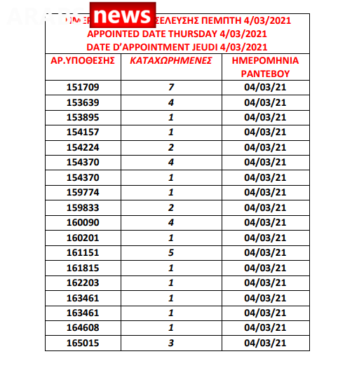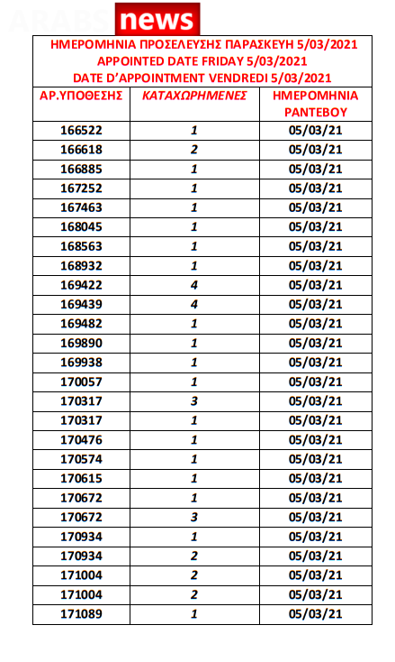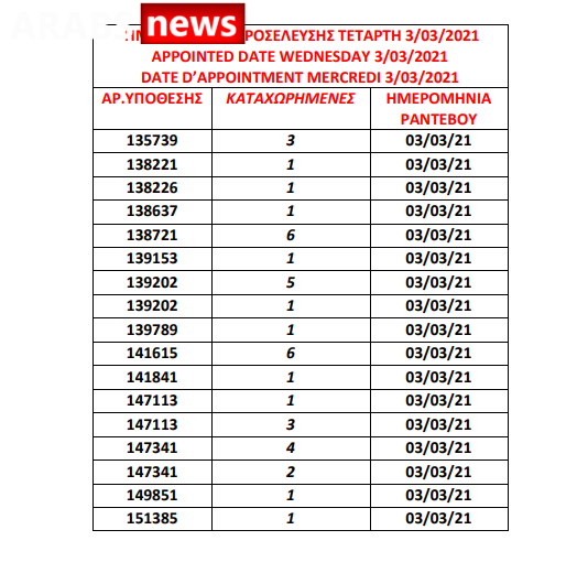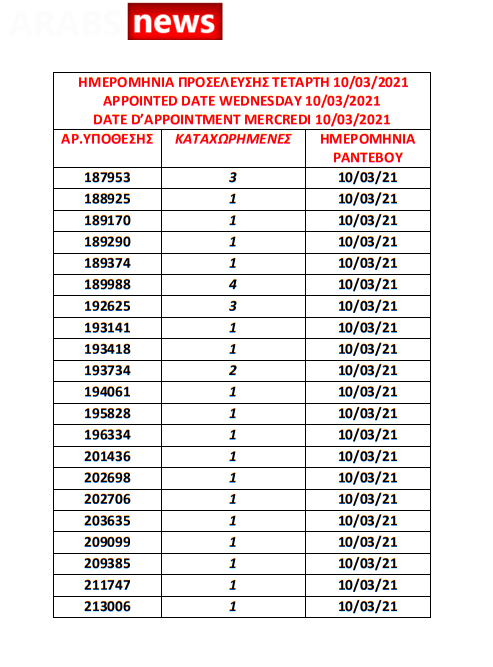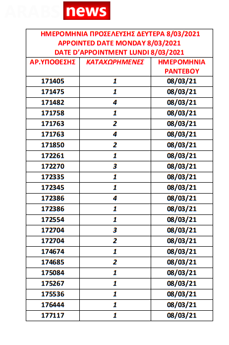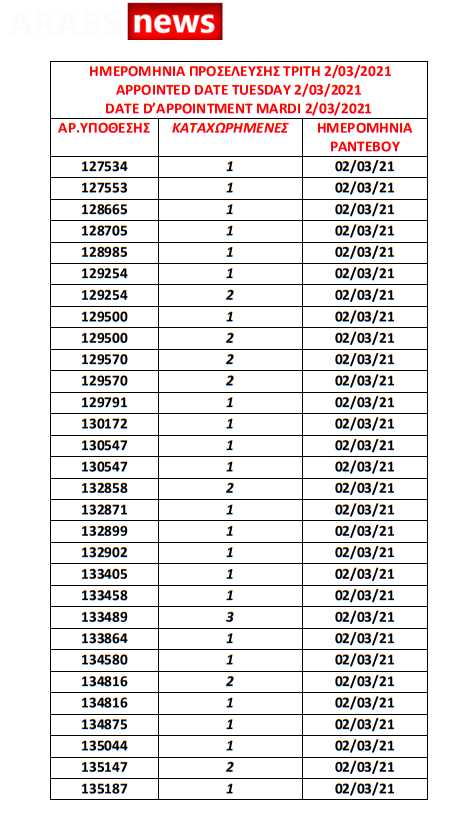 أصدرت دائرة اللجوء اليونانية اليوم الثلاثاء 16 فبراير 2021 أرقام جوازات السفر الجاهزة الخاصة بحالات اللجوء، وسيتم تسليم الجوازات بين 03،02،01 ،04، 05، 08 مارس 2021، كما هو موضح أدناه.